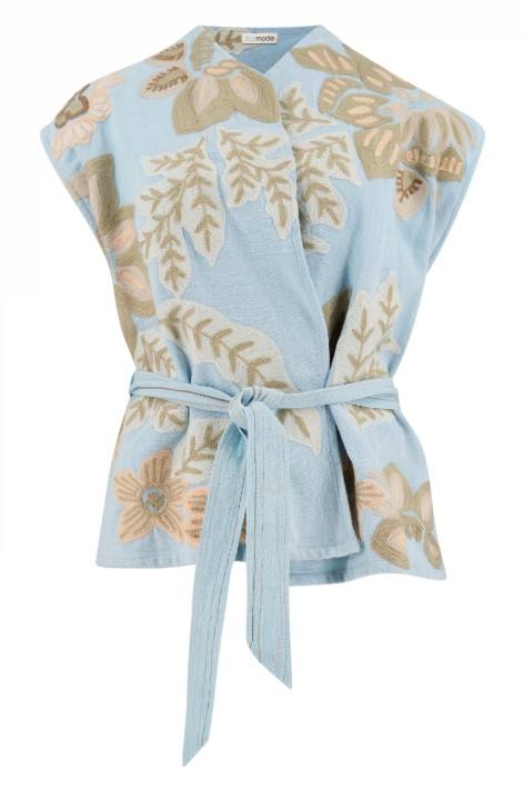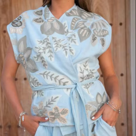 เสื้อคลุมสไตล์คลาสสิกสำหรับผู้หญิงเสื้อโบฮีเมียนปักลายดอกไม้สีฟ้าอ่อนแบบสั้นสำหรับวันหยุดฤดูร้อน