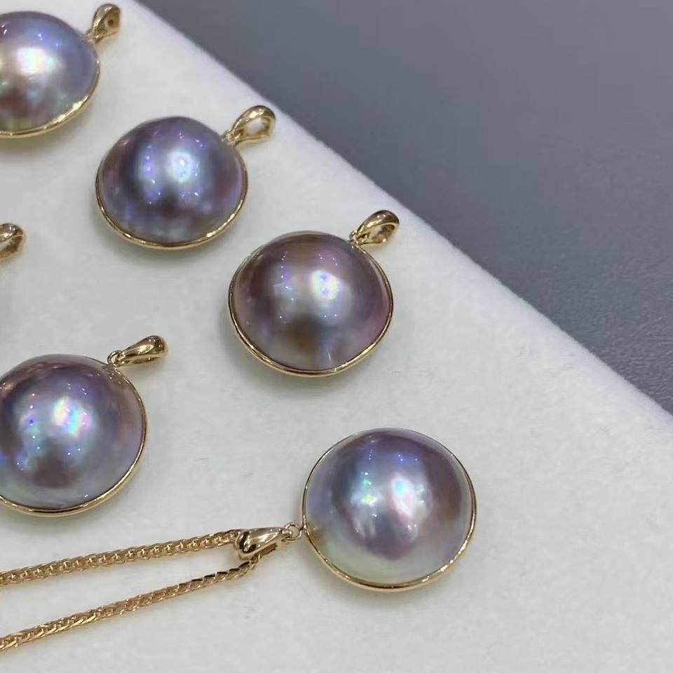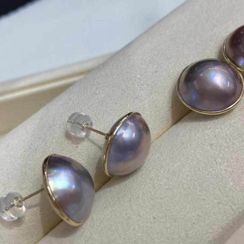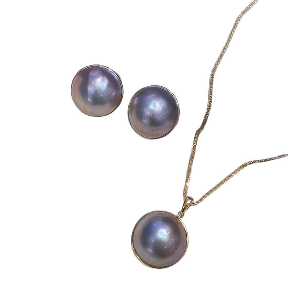 Classic Women's K18 Natural Purple Sea Water Mabe Pearl Earring Pendant Set 15-16mm High Grade Flawless Everyday Wear