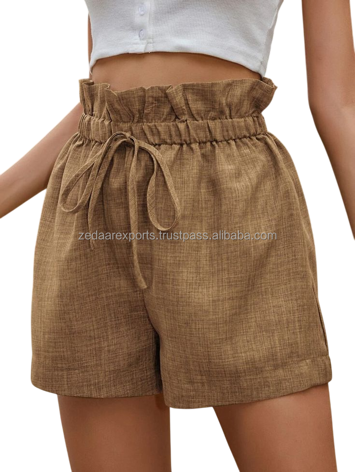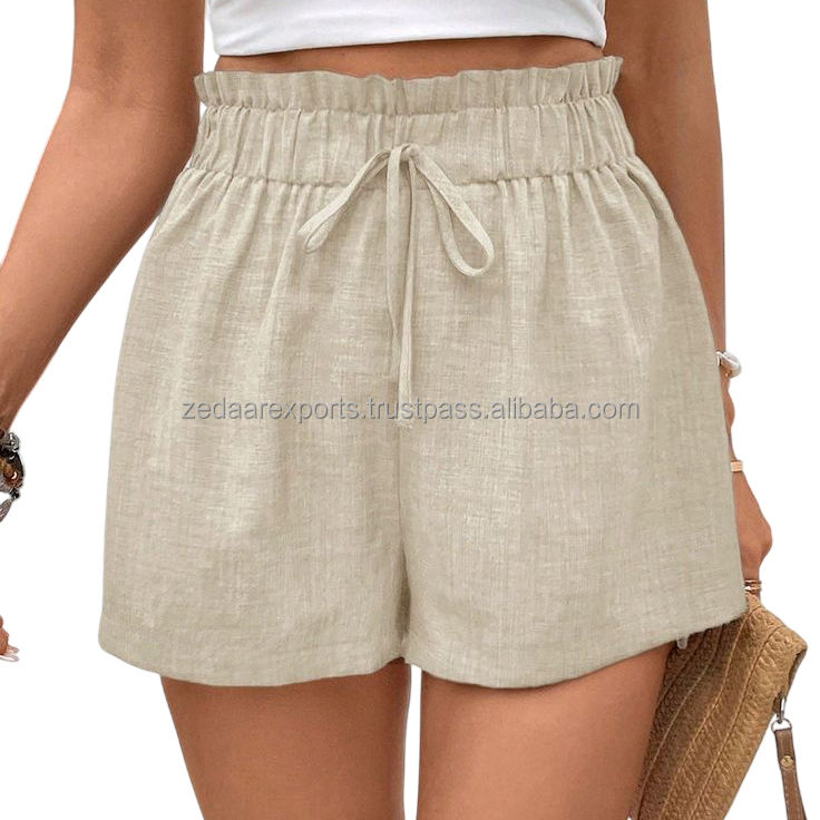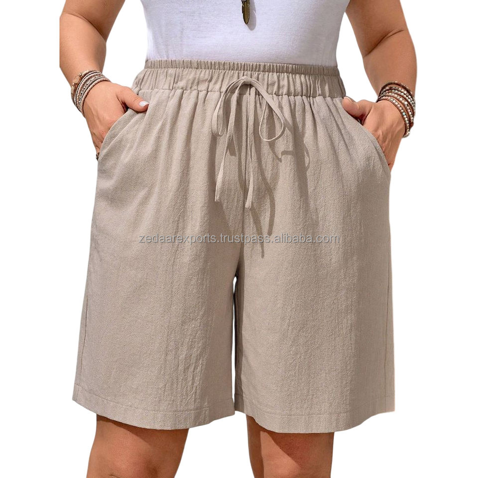 กางเกงขาสั้นผ้าลินินของผู้หญิงคลาสสิกสบายระบายอากาศหลวมเอวปรับขนาดได้สไตล์ลำลองทอวิธีการทอ