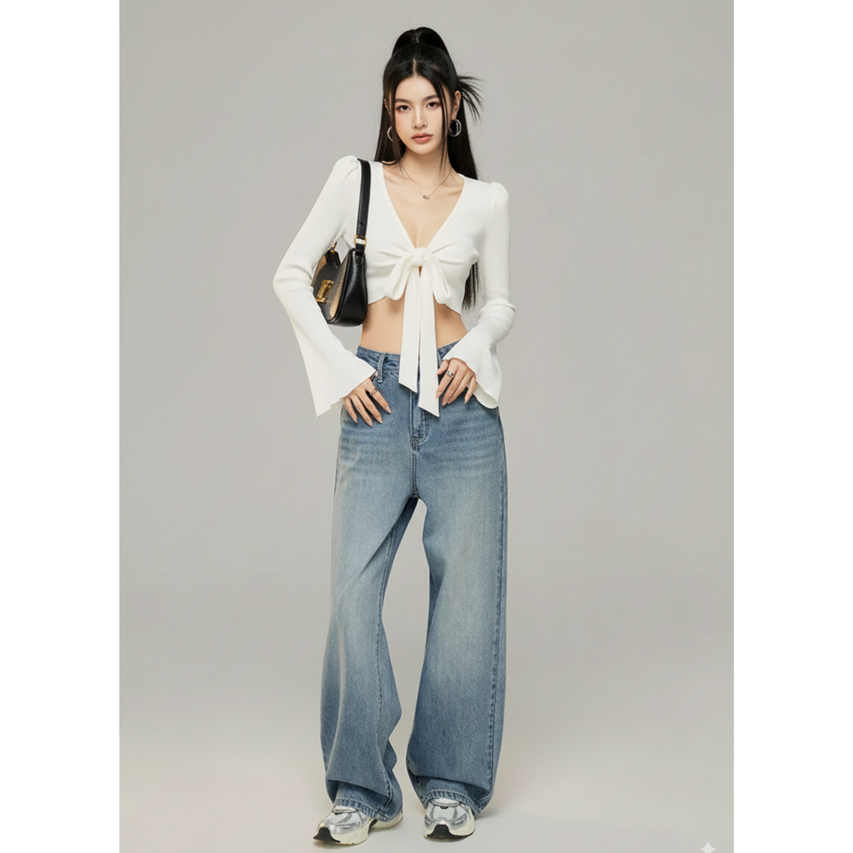 เสื้อครอปท็อปผู้หญิง แขนยาว คอวี ผูกด้านหน้า ผ้าคอตตอน 100% ทรงปกติ ผ้าถักลายริบ สำหรับลุคสบายๆ สไตล์ชิค
