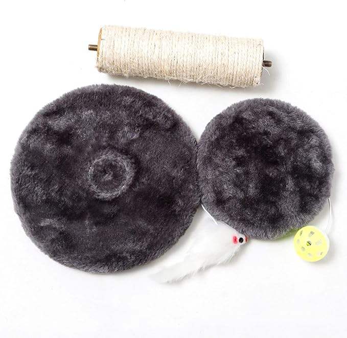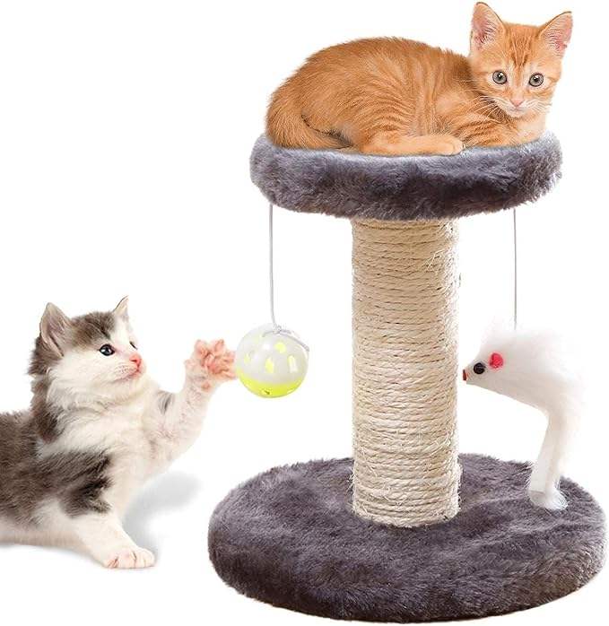 เสาข่วนเล็บแมวไม้แบบคลาสสิกและต้นไม้แมวขนาดเล็กพร้อมเสาป่านธรรมชาติ ที่นอนทรงกลม และลูกบอลกำมะหยี่ สำหรับแมวตัวเล็ก
