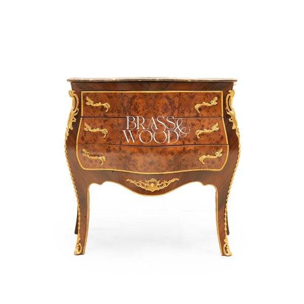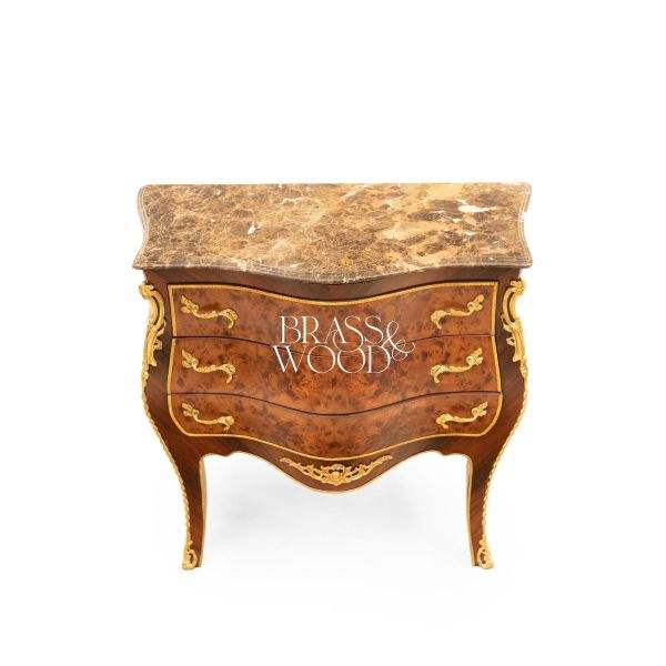 ตู้ลิ้นชักไม้คลาสสิกพร้อมท็อปหินอ่อน ด้านหน้าโค้งลายไม้เบิร์ล พร้อมรายละเอียดทองเหลืองชุบทอง ดีไซน์หรูหรา