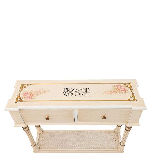 โต๊ะคอนโซลไม้คลาสสิกพร้อมท็อปกระจก ลิ้นชักสองชั้น ชั้นวางของด้านล่างลายหวาย ตกแต่งด้วยงานเพ้นท์มือ สไตล์ฝรั่งเศสสุดหรู