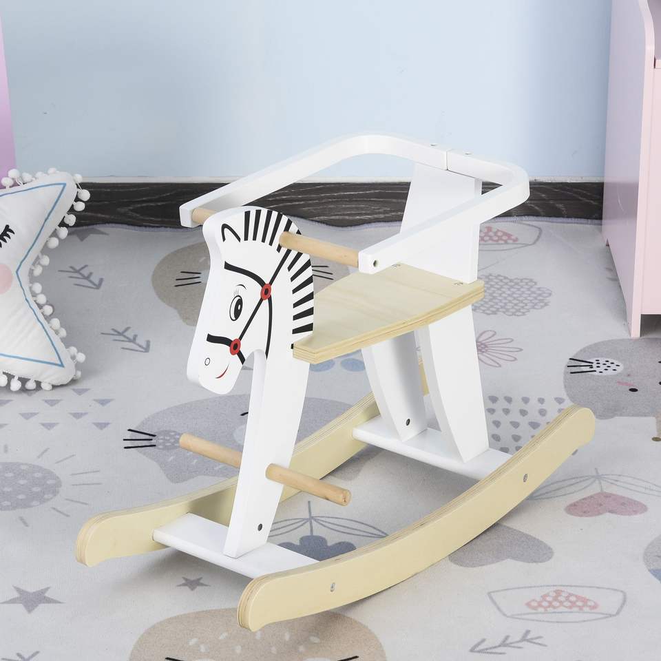 ม้าโยกไม้คลาสสิกสำหรับเด็กวัยหัดเดิน 1-3 ปี สีขาว พร้อมราวจับนิรภัย ของเล่นขี่แบบดั้งเดิมที่ปลอดภัยและอุปกรณ์เสริม
