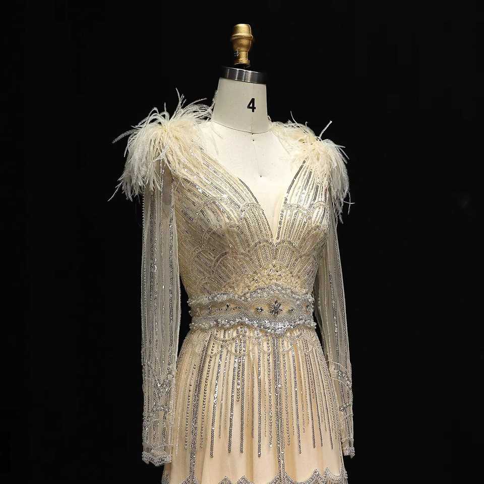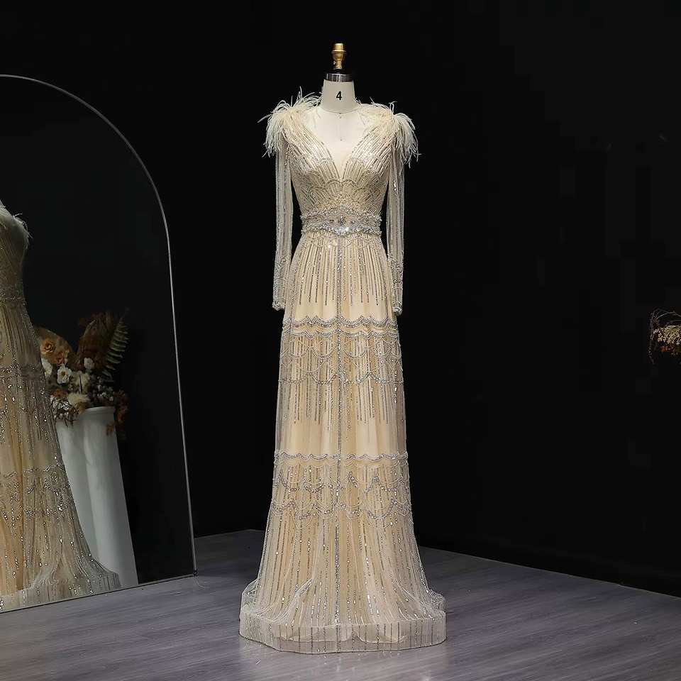 เดรสปาร์ตี้ตอนเย็นแขนยาวสีแชมเปญคลาสสิก