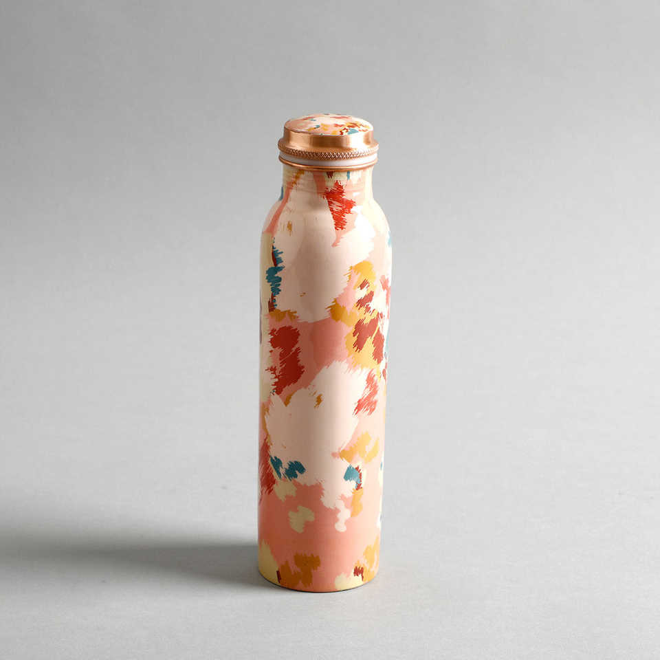 ขวดน้ำสีทองแดงคลาสสิก ตกแต่งด้วยงานศิลปะมีนาคารีสีสันสดใส ผิวสัมผัสเรียบเนียน