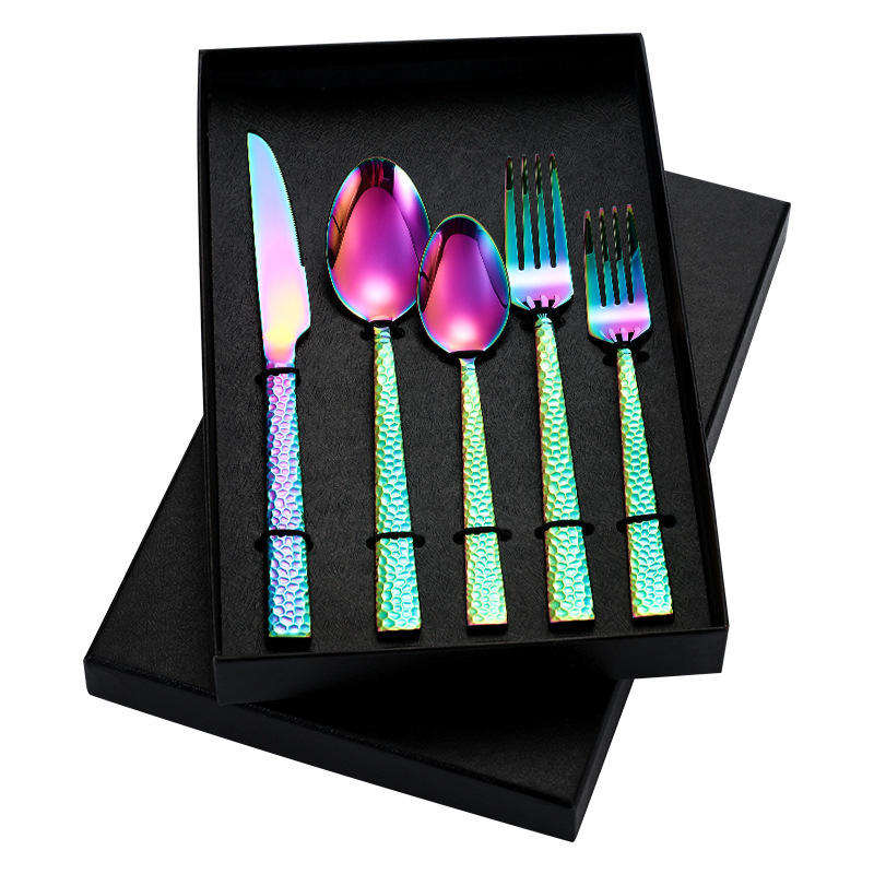 ชุดช้อนส้อมสายรุ้งคลาสสิกที่มีลวดลายหลากสีขัดเงามอบความทนทานและสไตล์สำหรับห้องครัวในบ้านและพื้นที่รับประทานอาหาร
