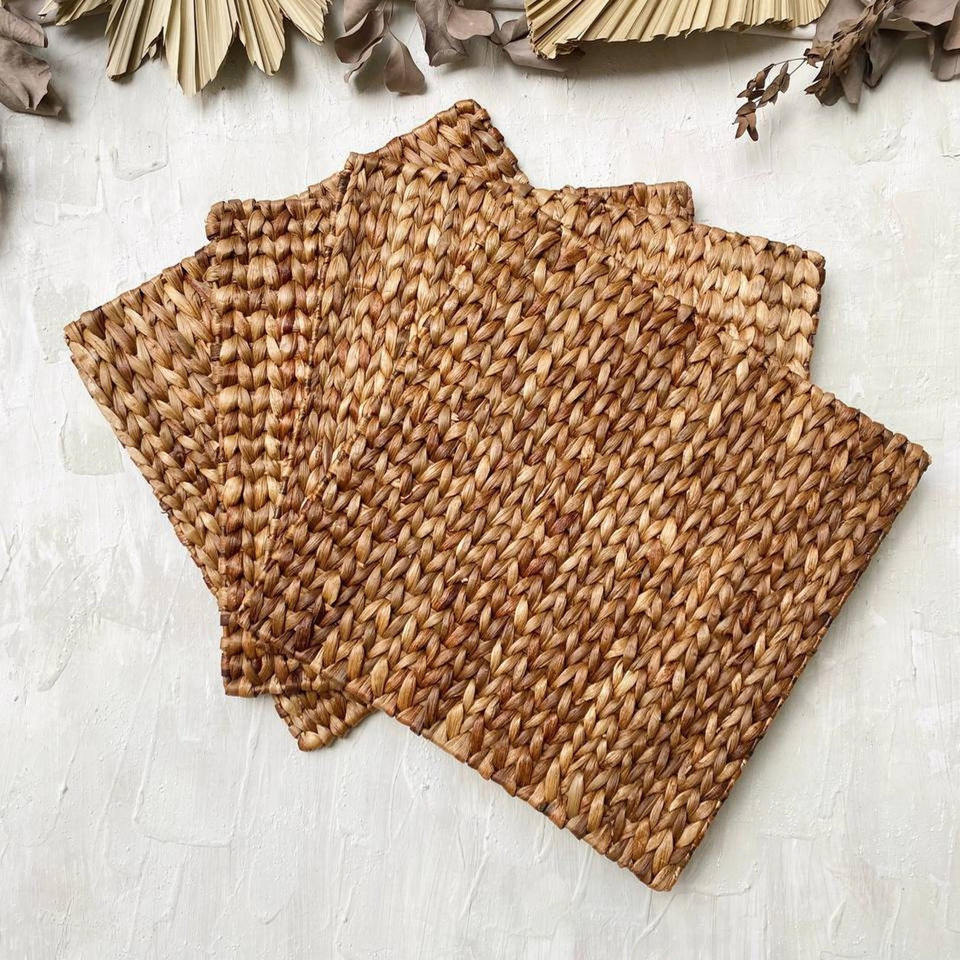 จานผักตบชวาแบบถักด้วยมือทรงสี่เหลี่ยมคลาสสิกแผ่นรองจานตกแต่งโต๊ะแผ่นรองจานธรรมชาติ