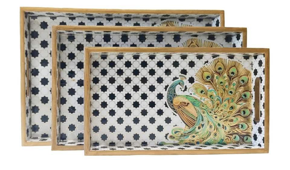 ชุดถาดเสิร์ฟไม้ทรงสี่เหลี่ยมพิมพ์ลายดีไซน์คลาสสิก 3 ชิ้น คุณภาพพรีเมียม ทนทาน เงางาม ถาดเสิร์ฟไม้ตกแต่ง