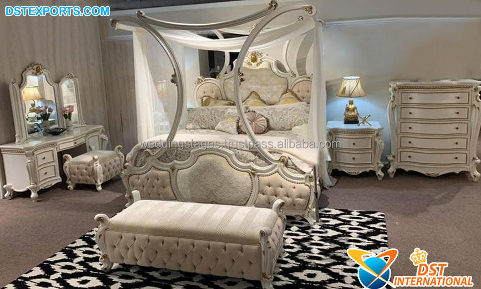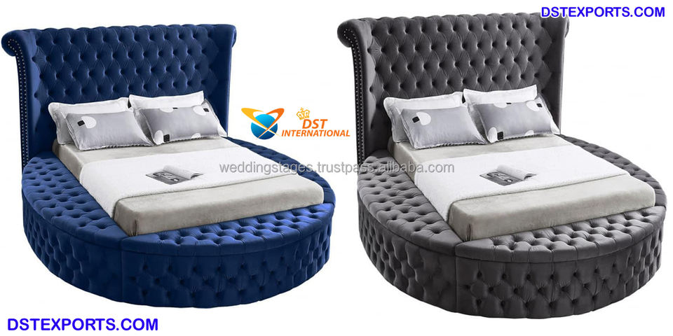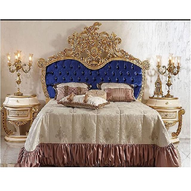 เตียงนอนสีน้ำเงินคลาสสิกแบบราชวงศ์ พร้อมโต๊ะข้างเตียง ดีไซน์หรูหรา ไม้สักขัดเงาสีทอง แกะสลักลายทองทันสมัย เตียงคิงไซส์