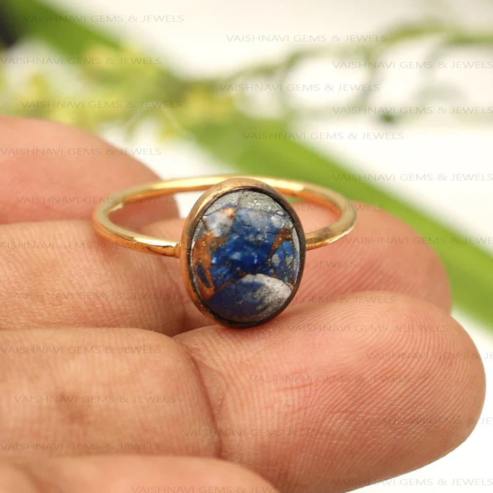 สไตล์คลาสสิกทองแดงธรรมชาติ Lapis Lazuli แหวน925เงินสเตอร์ลิง8x10มม. รูปไข่18พันชุบทองเครื่องประดับขายส่งสำหรับผู้หญิง