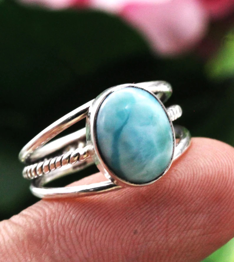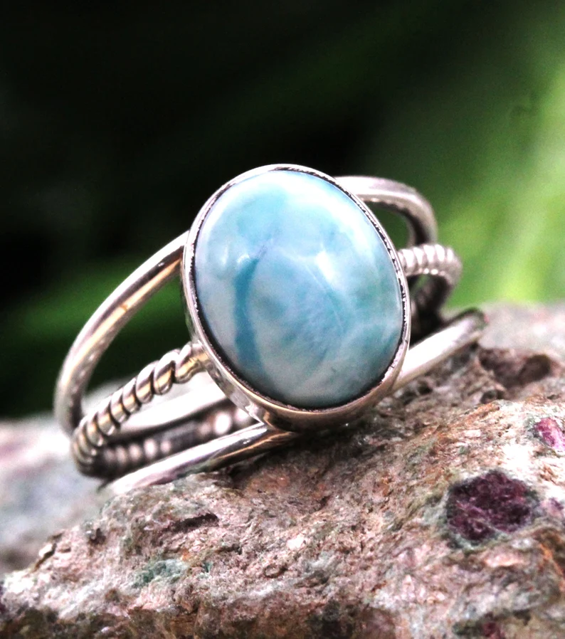 แหวนเงินแท้ 925 ประดับพลอยลาริมาร์ทรงรี งานแฮนด์เมดคุณภาพสูง พร้อมการฝังแบบเบเซลที่ได้รับการรับรอง