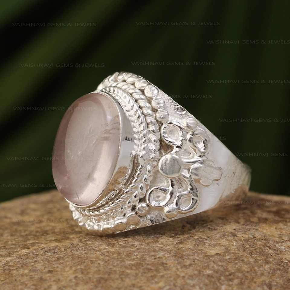 แหวนควอทซ์โรสธรรมชาติดีไซน์คลาสสิกขนาด10X14มม. รูปไข่925พลอยสเตอริงเงินเครื่องประดับสีชมพูแบบเรียบง่าย