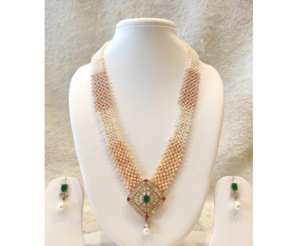 ชุดเครื่องประดับมุกหรูหราคุณภาพพรีเมียม ชุบทอง ประดับเพชร CZ ดีไซน์ยาวทันสมัย พร้อมต่างหู สำหรับงานแต่งงาน