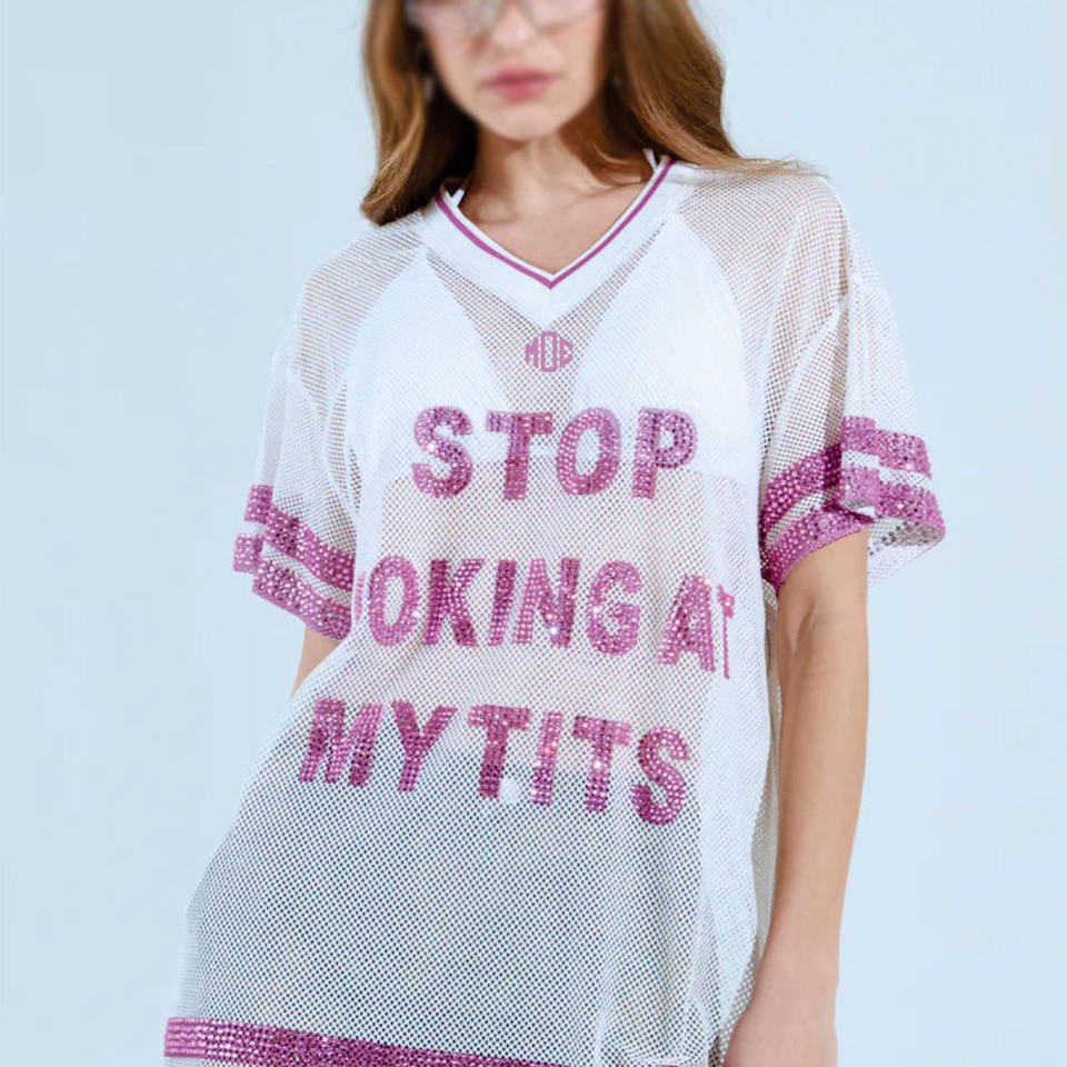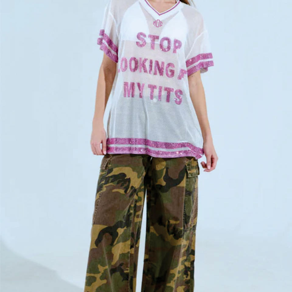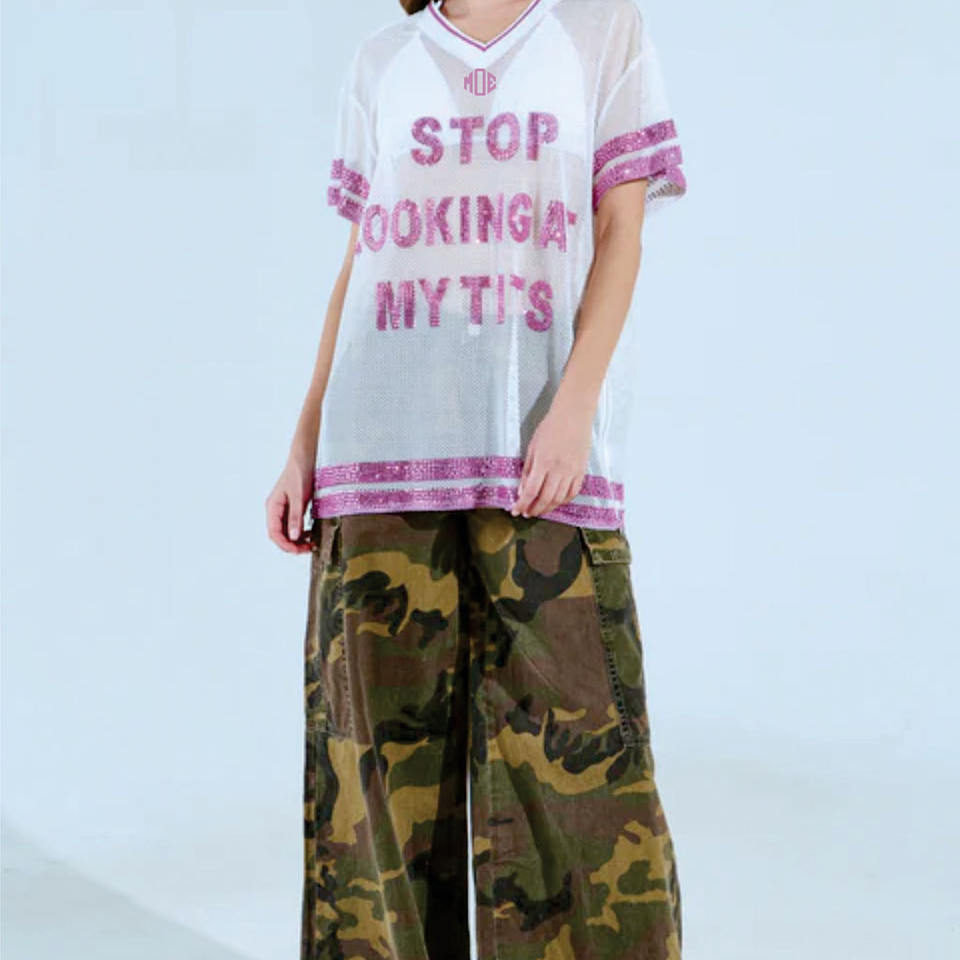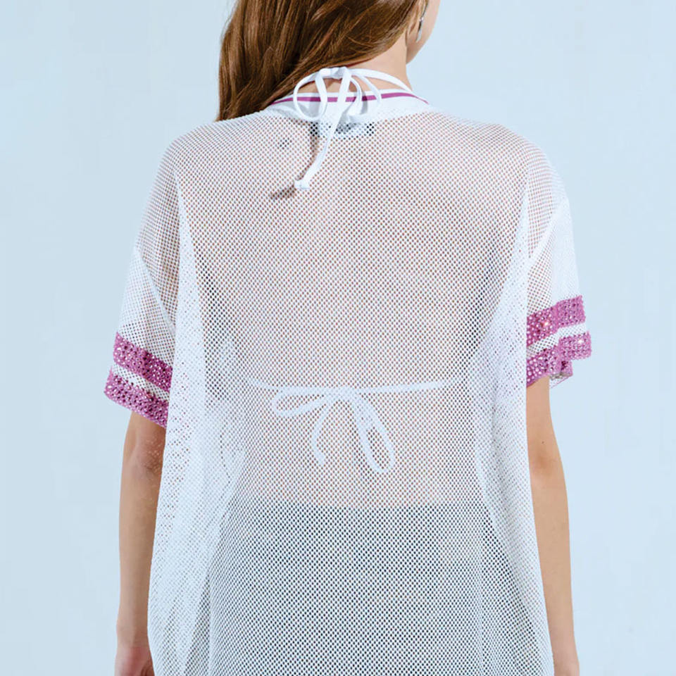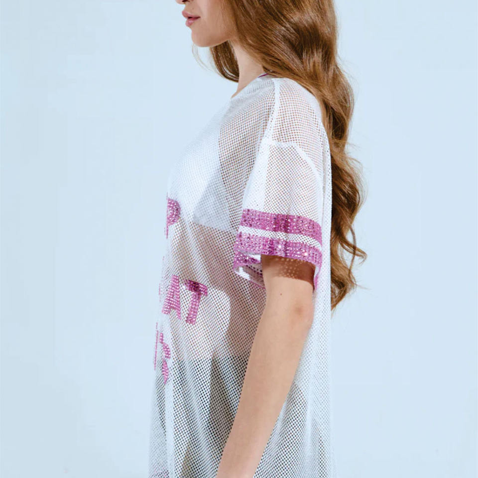 เสื้อเจอร์ซีย์อเมริกันฟุตบอลผู้หญิงทรงโอเวอร์ไซส์ ดีไซน์ตัวอักษรประดับเพชร น้ำหนักเบา ระบายอากาศได้ดี ผ้าตาข่าย รับผลิตแบบ OEM ขายส่ง