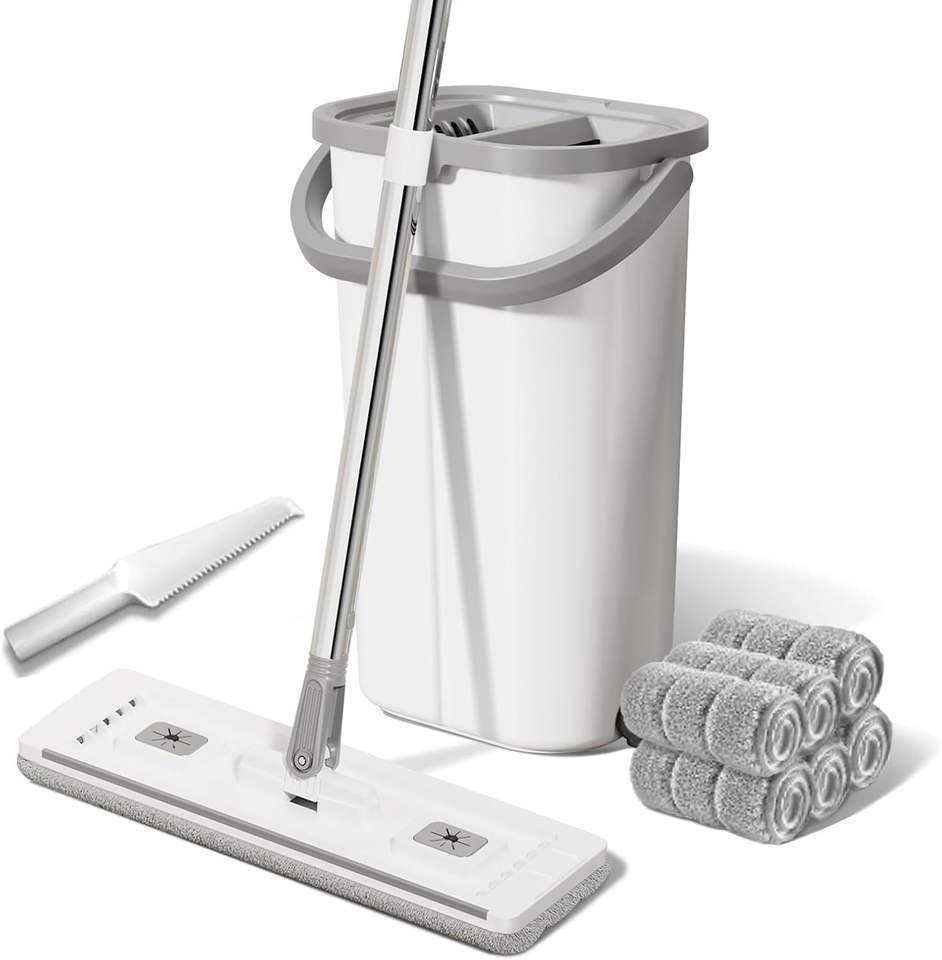 ไม้ถูพื้นแบบแบน อุปกรณ์ทำความสะอาดบ้าน ไม้ม็อบไมโครไฟเบอร์สำหรับปัดฝุ่นพื้น พร้อมถัง