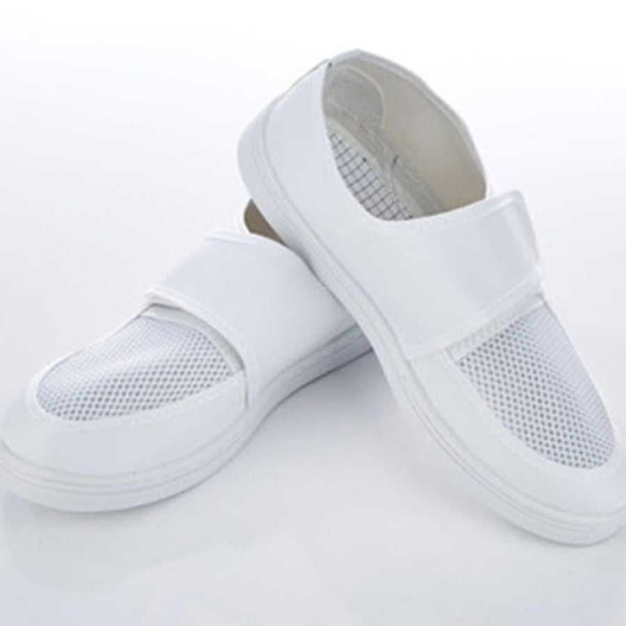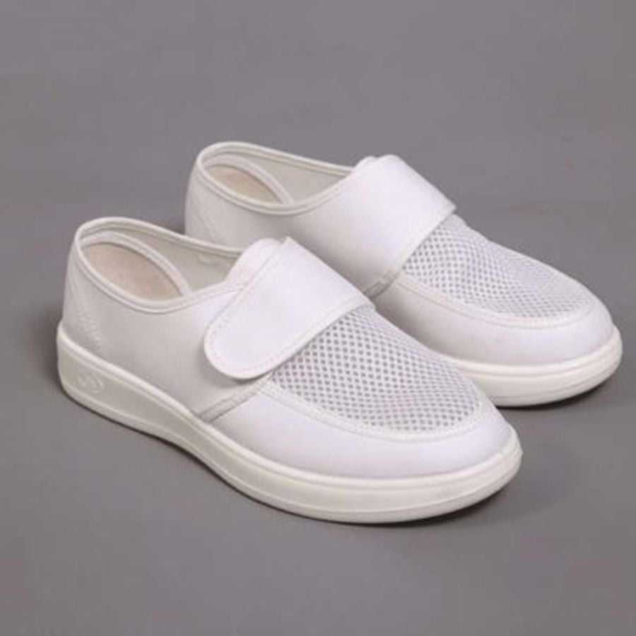 รองเท้าทำงานสีขาวป้องกันไฟฟ้าสถิตย์สำหรับห้องคลีนรูม ปลอดภัยตามมาตรฐาน ESD แบบสวม สำหรับโรงงานอิเล็กทรอนิกส์และเซมิคอนดักเตอร์