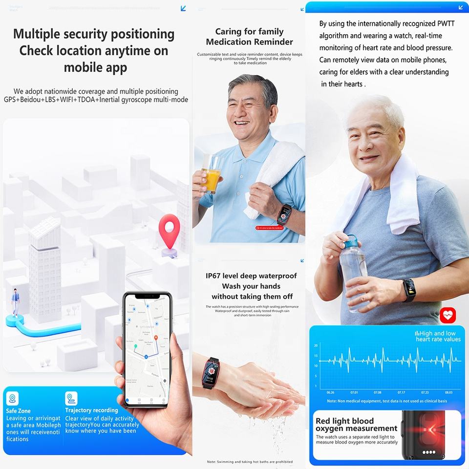 คุณสมบัติ:GPS หรือ LBS ตำแหน่ง/โทรด้วยเสียง/SOS โทรฉุกเฉิน, การทดสอบสุขภาพ