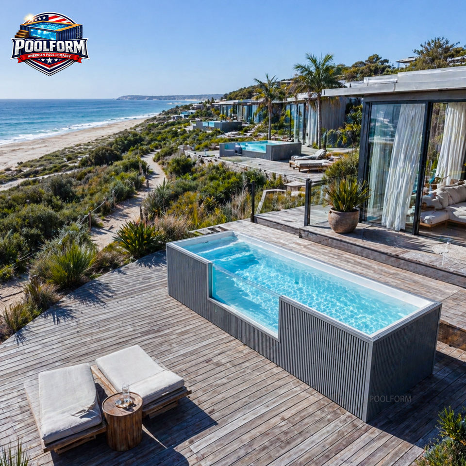 สระว่ายน้ำสำเร็จรูปแบบตั้งพื้นพร้อมสปาในตัว วัสดุ WPC คุณภาพพรีเมียม โครงสร้างไฟเบอร์กลาส