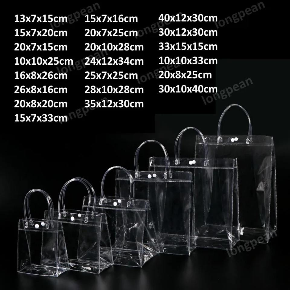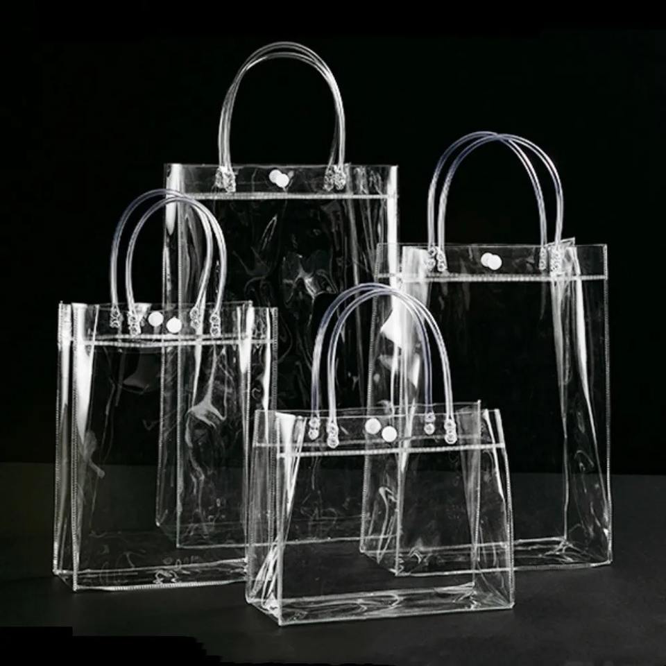 ถุงช้อปปิ้งพีวีซีใสพร้อมหูหิ้วกระเป๋าโท้ทพลาสติกใสใช้ซ้ำได้พร้อมโลโก้ที่กำหนดเองสำหรับบรรจุภัณฑ์ของขวัญบูติก