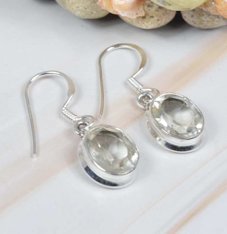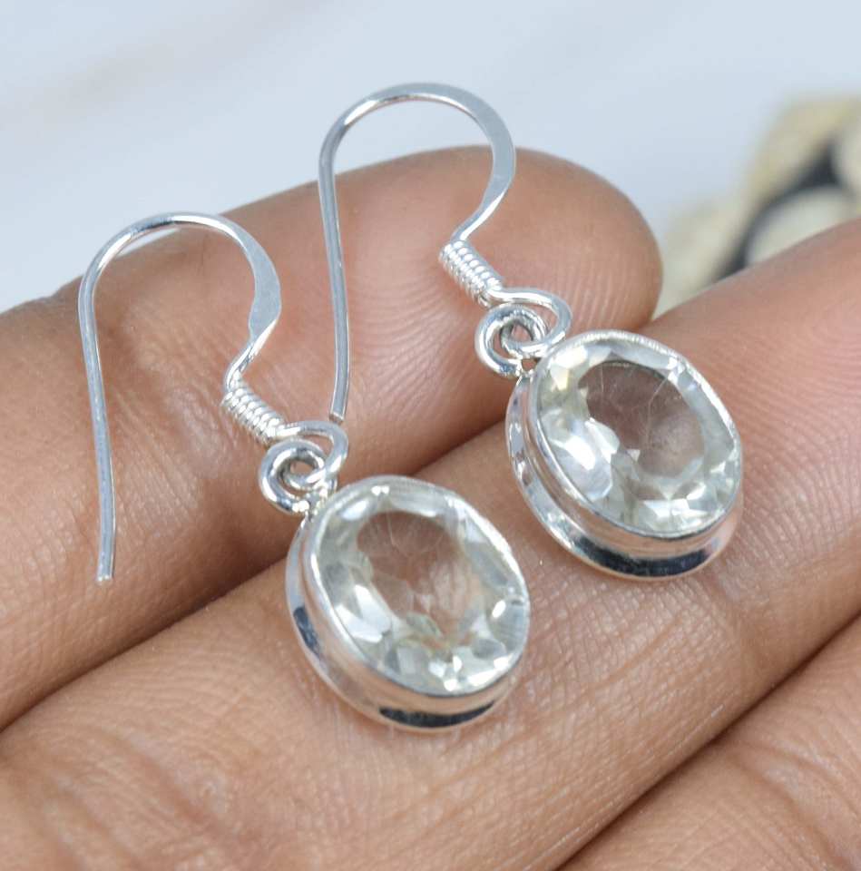 ต่างหูควอตซ์ใสคุณภาพสูงต่างหูพลอยควอตซ์ต่างหูตัดรูปไข่ต่างหูชาติพันธุ์ห้อยเครื่องประดับ925ชุบเงิน