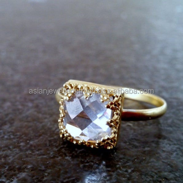 แหวนพลอยควอตซ์ใส925เงินแท้ทำด้วยมือชุบทองสวยงามเครื่องประดับแฟชันไม่ซ้ำใคร