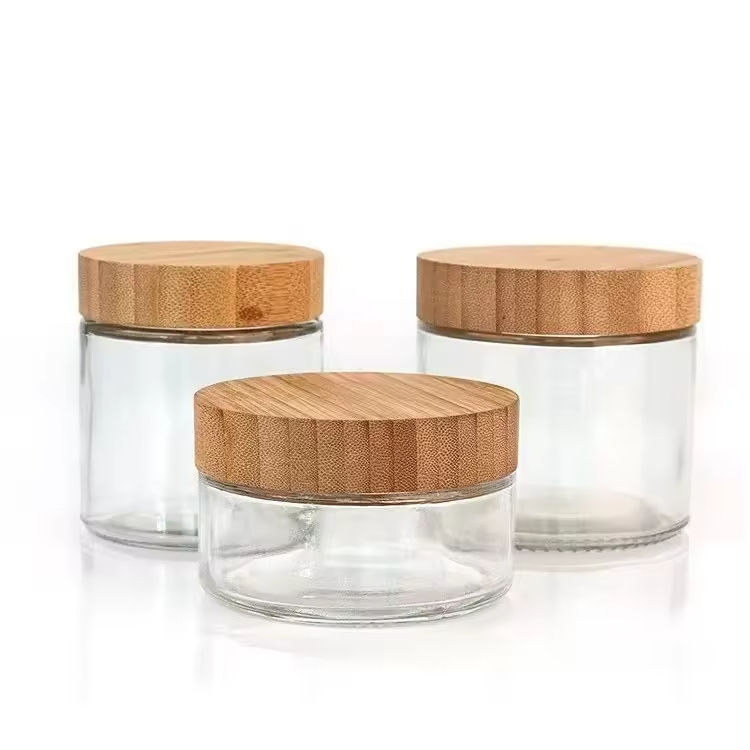 ขวดแก้วใสทรงกลมขนาดใหญ่สำหรับครีม พร้อมฝาไม้ไผ่