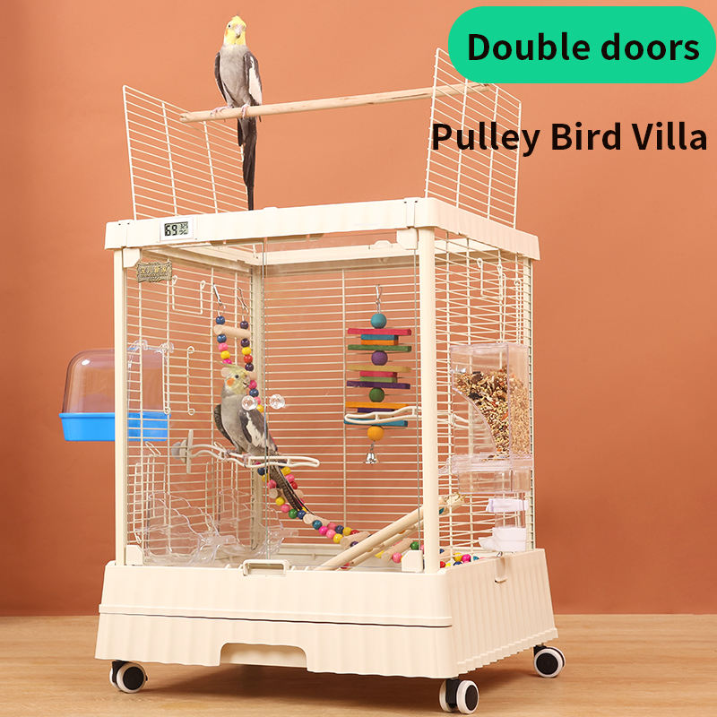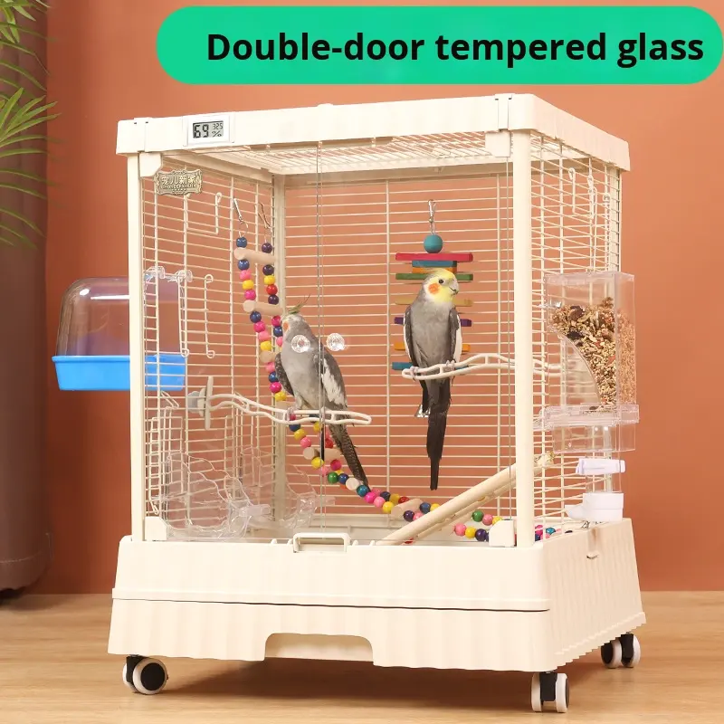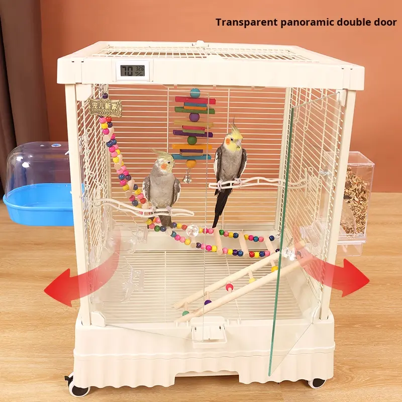 กรงนกแบบใส รุ่นกลาง สำหรับผู้เริ่มต้น กรงสีขาวพร้อมที่เล่นแบบเปิดด้านบนและขาตั้งแบบมีล้อ กรงนกทำจากอะคริลิก