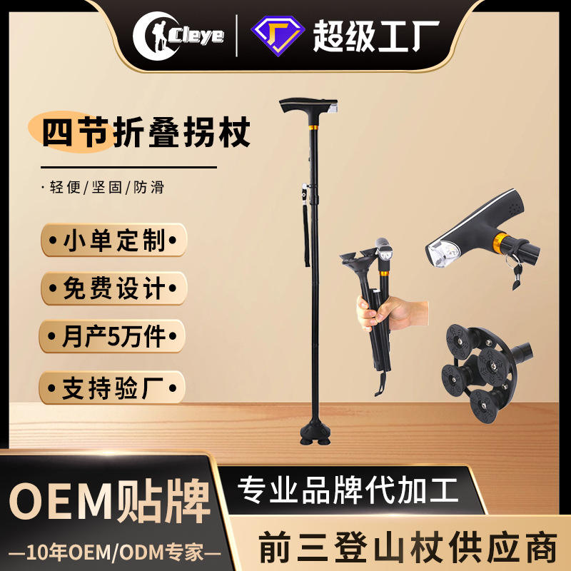 ไม้เท้าพับได้ Cleye แบบหนา 4 ขา พร้อมไฟส่องสว่าง แบบยืดหดได้ สำหรับผู้สูงอายุ สีดำ รุ่น 8007 1