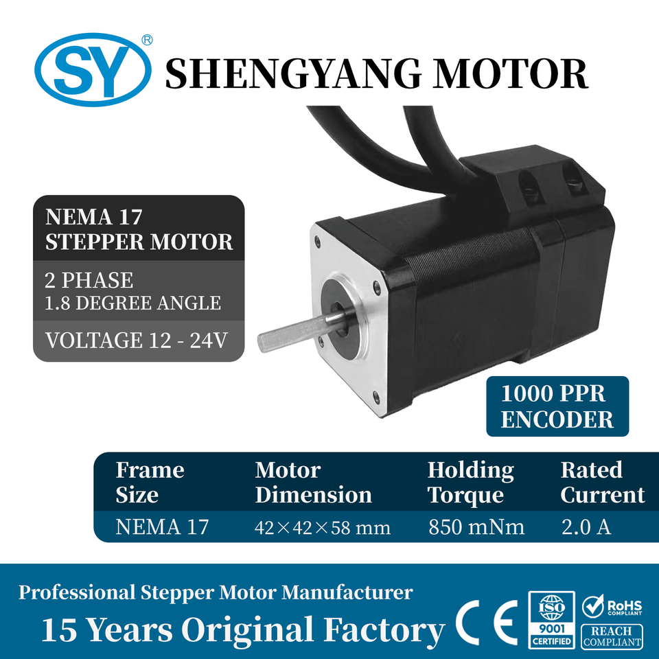 มอเตอร์สเต็ปเปอร์แบบวงปิด Nema 17 ขนาด 42x42x58 มม. พร้อมเอนโค้ดเดอร์ 1000PPR 850mNm 2.0A 12V