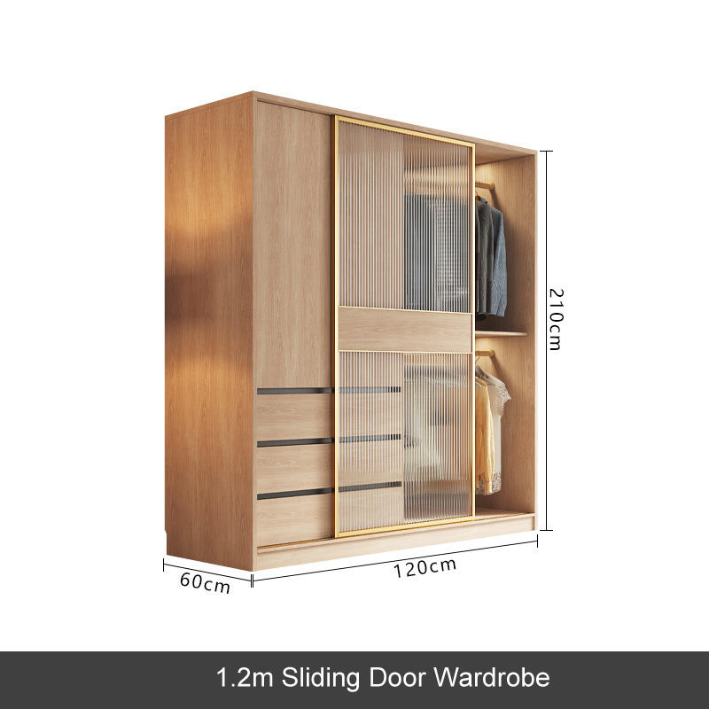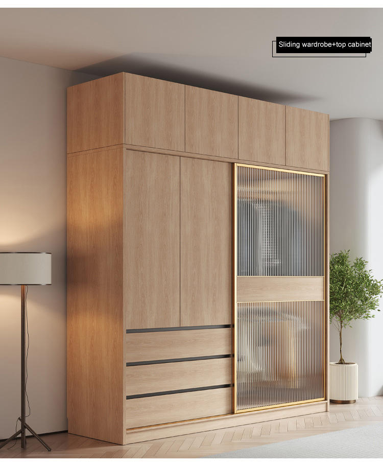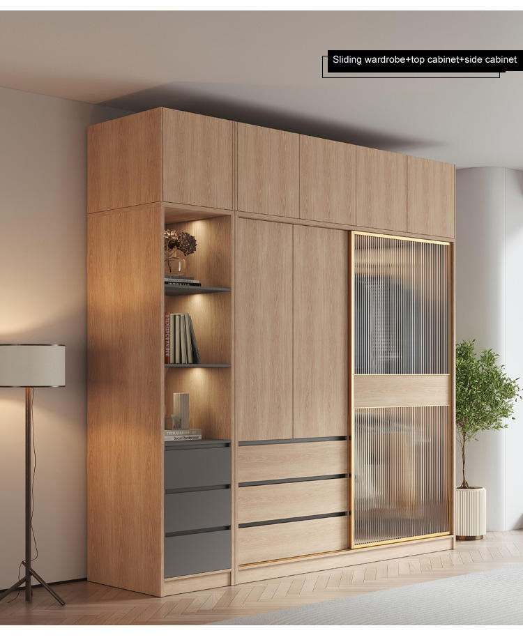 ตู้เสื้อผ้าบานเลื่อนกระจกนิรภัยไม้ดีไซน์ทันสมัยสำหรับห้องนอนพร้อมที่เก็บเสื้อผ้า