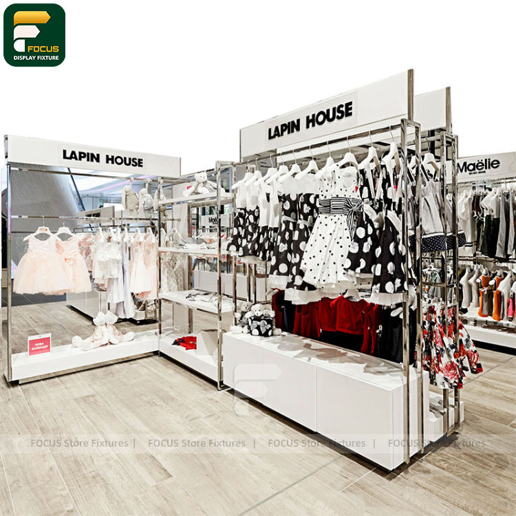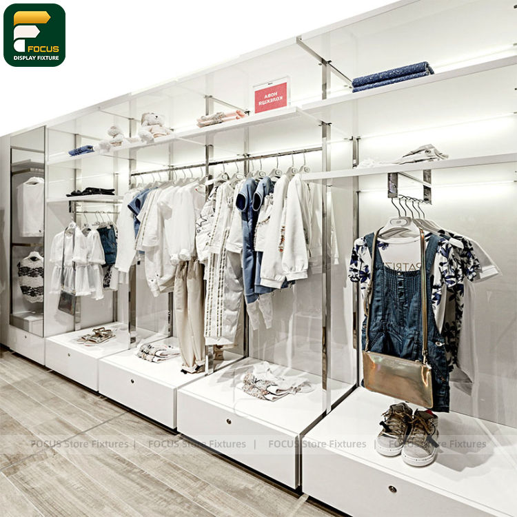 ชั้นวางเสื้อผ้าพร้อมแผงอะคริลิค ชั้นวางเสื้อผ้าสำหรับร้านค้าปลีก ดีไซน์อุปกรณ์จัดแสดงเสื้อผ้า