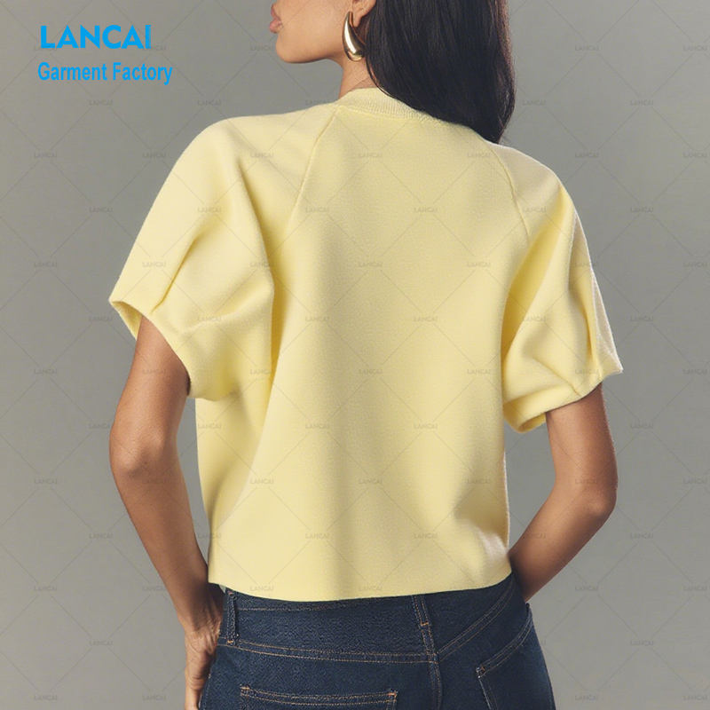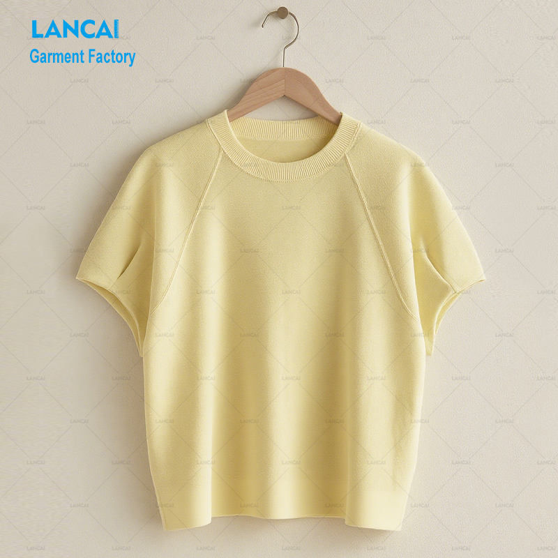 เสื้อคอกลมแขนสั้นสำหรับผู้หญิงเสื้อทรงหลวมสีเหลืองอ่อนคอกลมแขนแร็กแลนแบบออกแบบได้ตามต้องการสำหรับฤดูร้อน