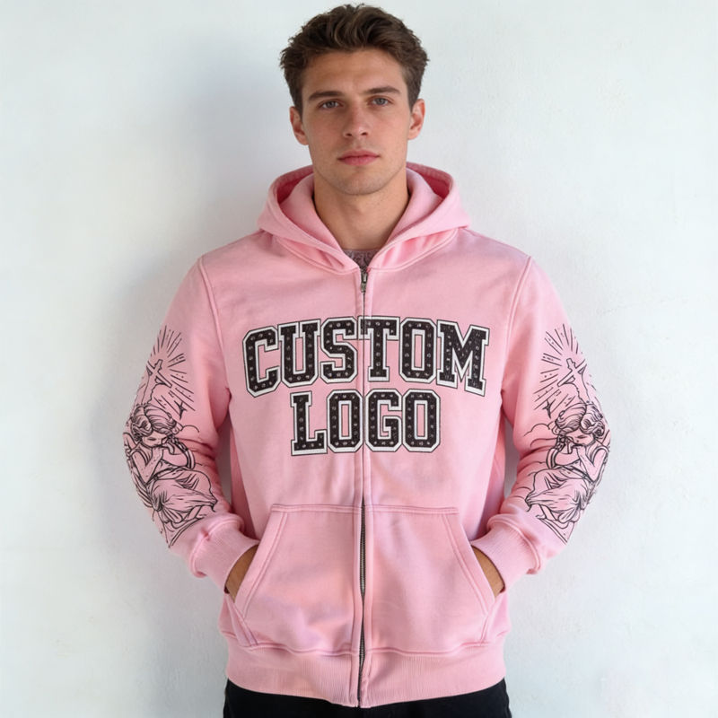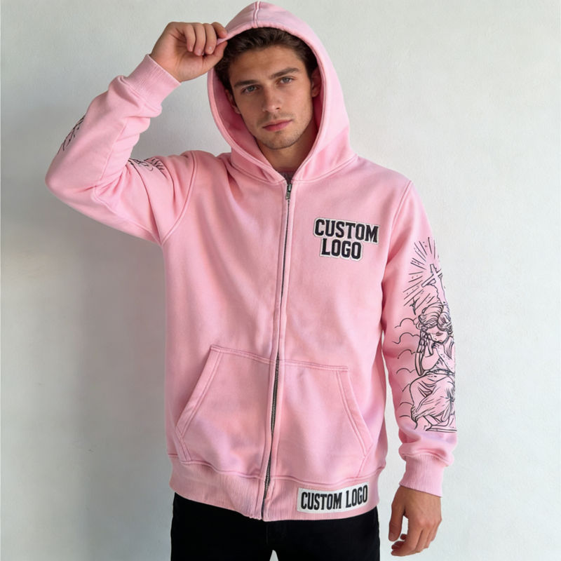 Clothing Manufacturer Men streetwear Hoodies Pink Hooded Zipper Large Custom Logo Tattoo Graphic Loose Fit Fleece Men Hoodies