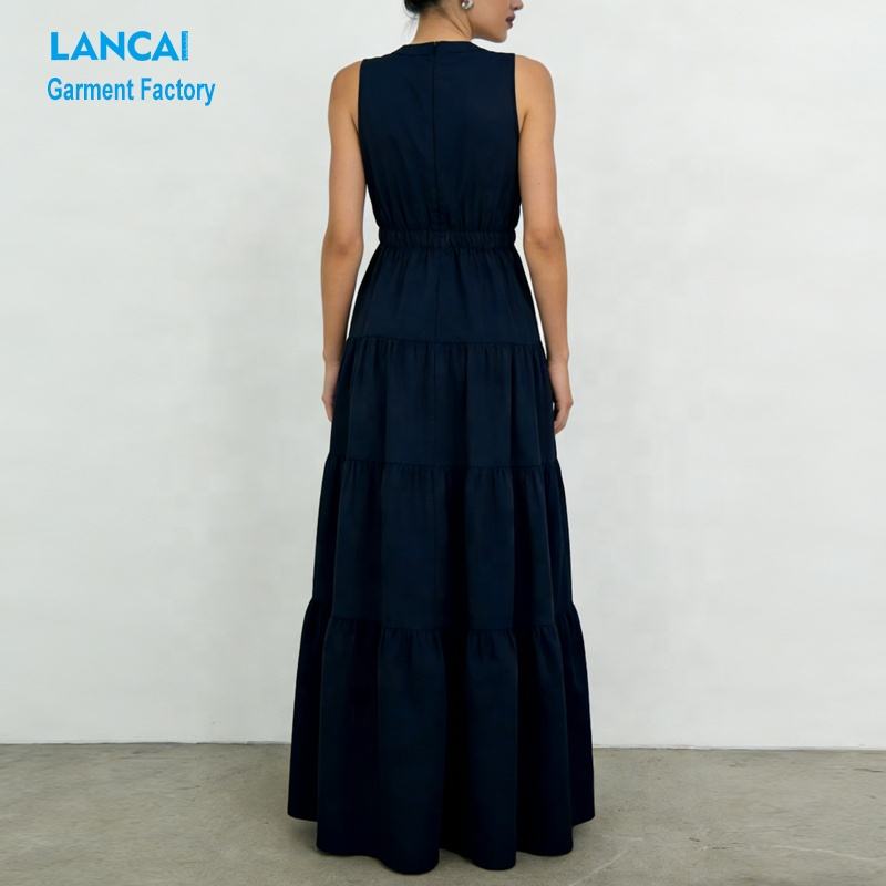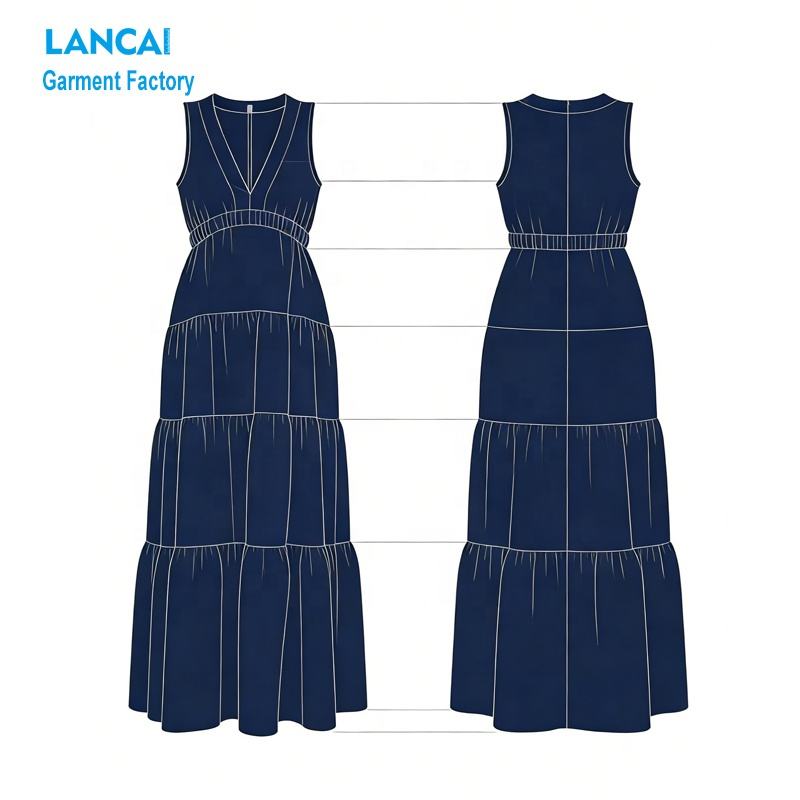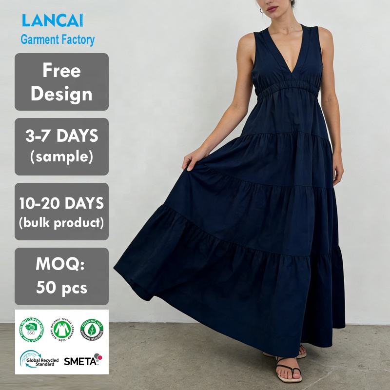 ผู้ผลิตเสื้อผ้าขายส่งเดรสคอวีแขนกุดผ้าฝ้ายฤดูร้อนแบบสั่งทำแบรนด์ส่วนตัวเดรสระบายชั้นและเดรสยาว