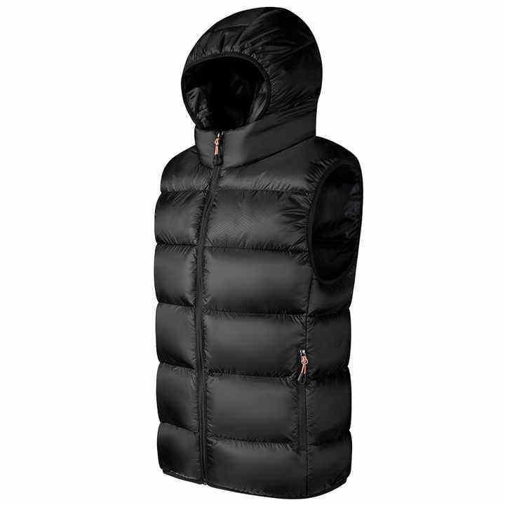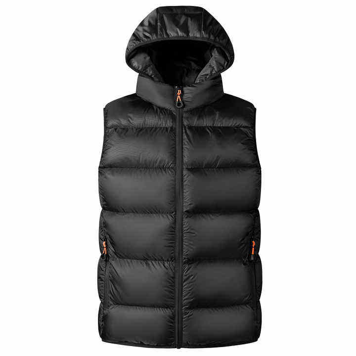 เสื้อกั๊กขนเป็ดแบบไม่มีแขนมีฮู้ดสำหรับผู้ชายเสื้อกั๊กลำลองสำหรับฤดูหนาวออกแบบโลโก้ได้ตามต้องการ