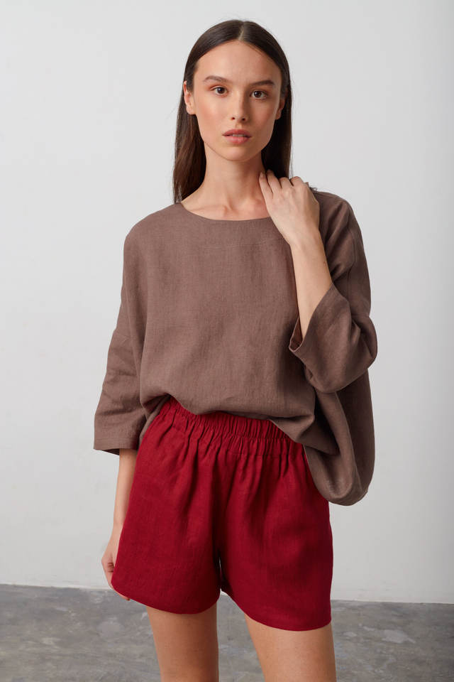 กางเกงขาสั้นเอวสูงผ้าลินินพิมพ์ลายสีน้ำตาลล้วนของผู้หญิงชุดฤดูใบไม้ผลิเอวยางยืดทำด้วยมือของผู้ผลิตเสื้อผ้ากางเกงผ่อนคลาย