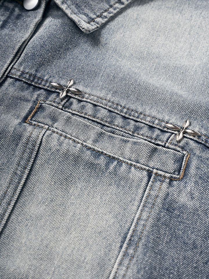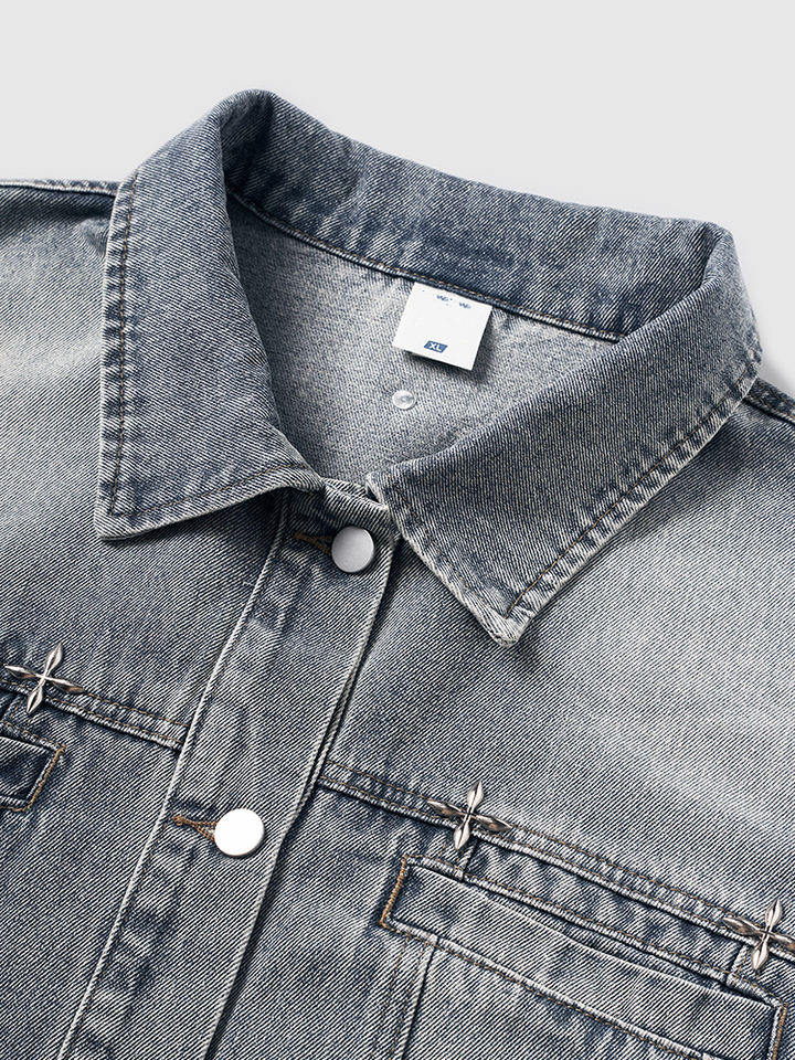 แจ็กเก็ตผ้ายีนส์หมุดย้ำสำหรับผู้ชายเสื้อผ้ายีนส์ออกแบบได้ตามต้องการ