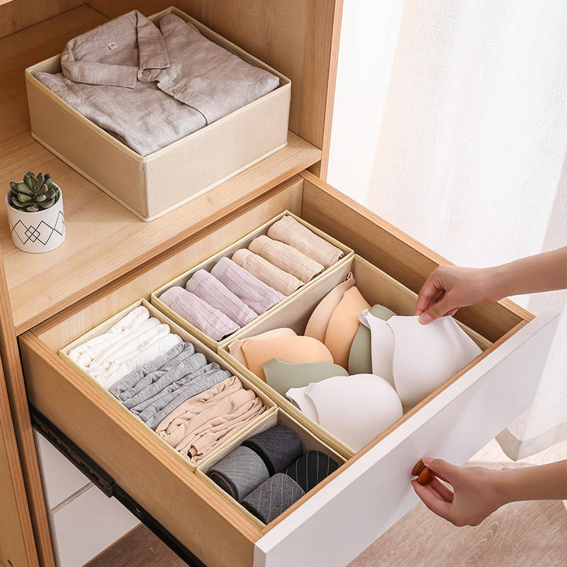 กล่องเก็บเสื้อผ้าแบบผ้า กล่องเก็บของแบบลิ้นชัก รูปทรงสี่เหลี่ยมผืนผ้า พับเก็บได้ ซ้อนกันได้ มีช่องสำหรับเก็บชุดชั้นใน ถุงเท้า กางเกงใน ใช้ในบ้าน