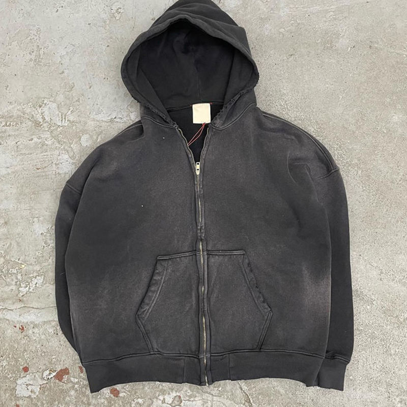 เสื้อฮู้ดฮิปฮอปทรงโอเวอร์ไซส์ผ้าเฟรนช์เทอร์รี่ปักลายสไตล์ดิสเทรสสำหรับผู้ชาย แบบซิปหน้า ผ้าหนา สำหรับฤดูหนาว รับผลิตตามแบบ