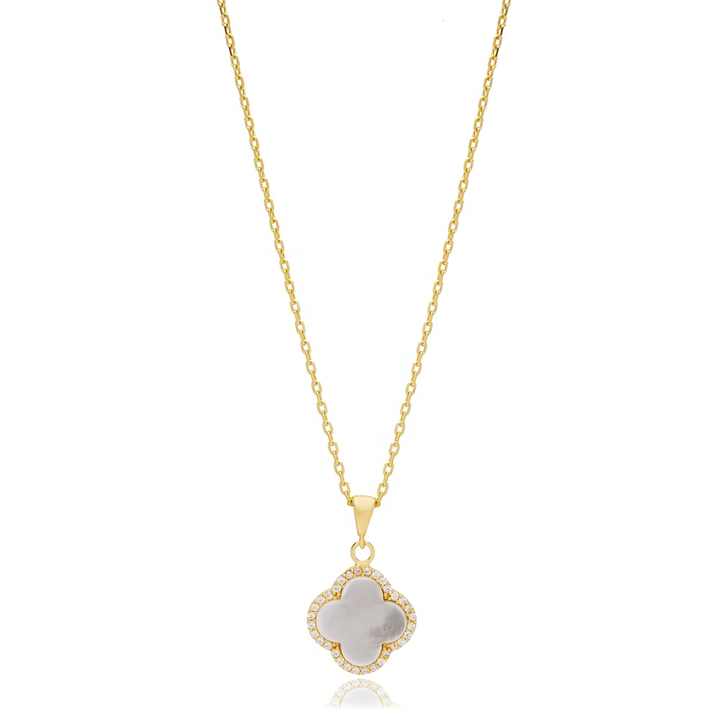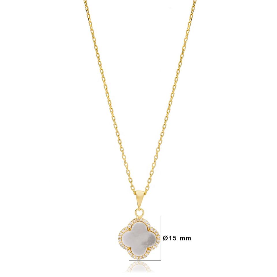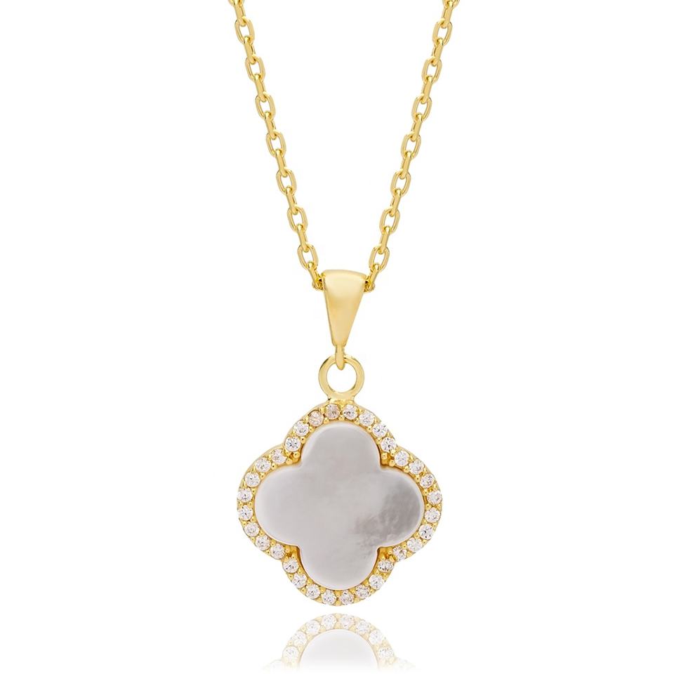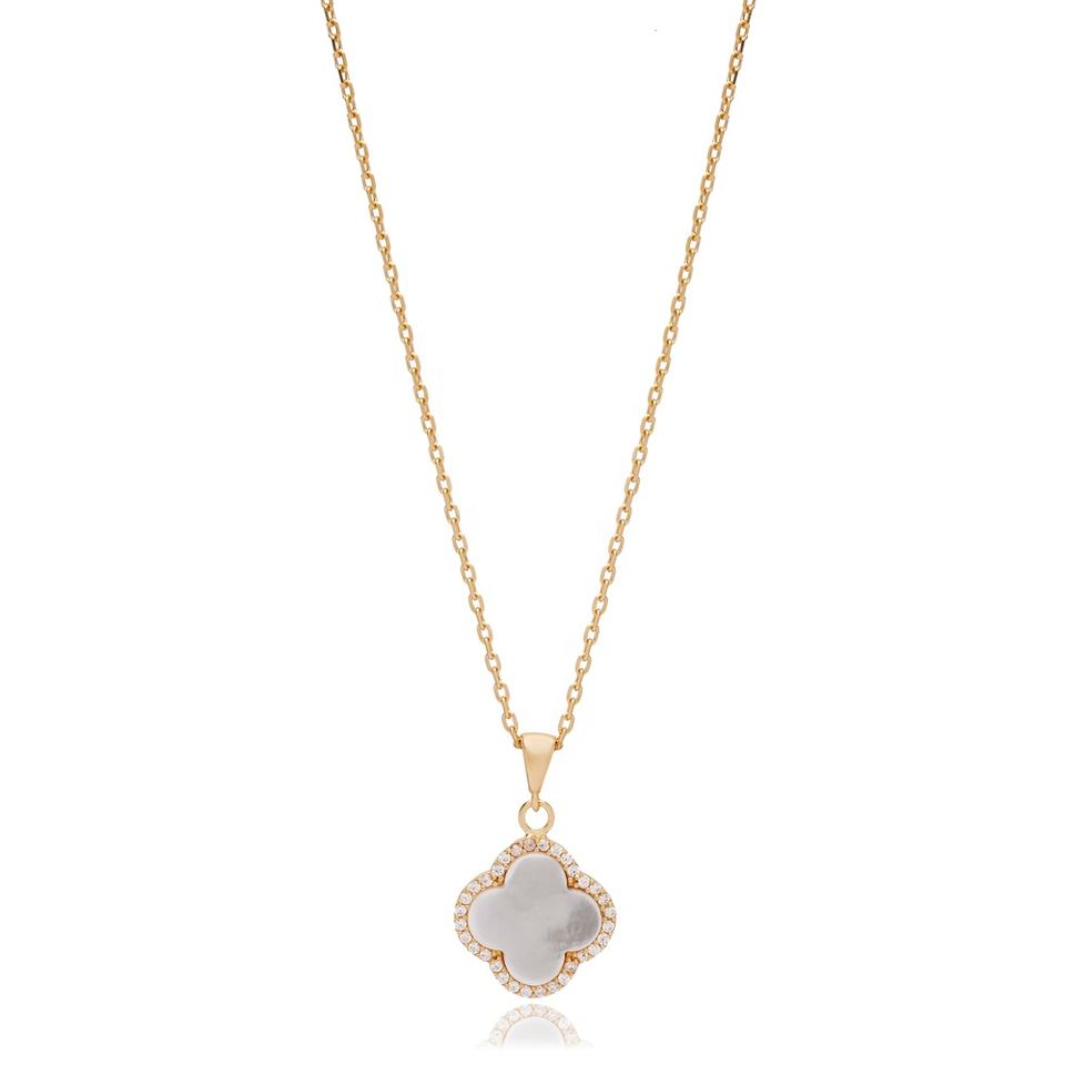 สร้อยคอดีไซน์รูปใบโคลเวอร์เปลือกหอยสีขาวเซอร์คอนทำด้วยมือแบบตุรกีเครื่องประดับชั้นดีทำจากเงินสเตอร์ลิง925