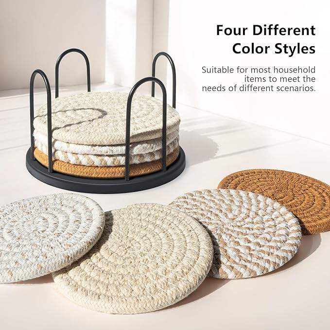 ชุดจานรองแก้ว 8 ชิ้น สำหรับเครื่องดื่ม เบียร์ กาแฟ ผ้าฝ้ายทอ 4 สี จานรองดูดซับน้ำ พร้อมที่วาง