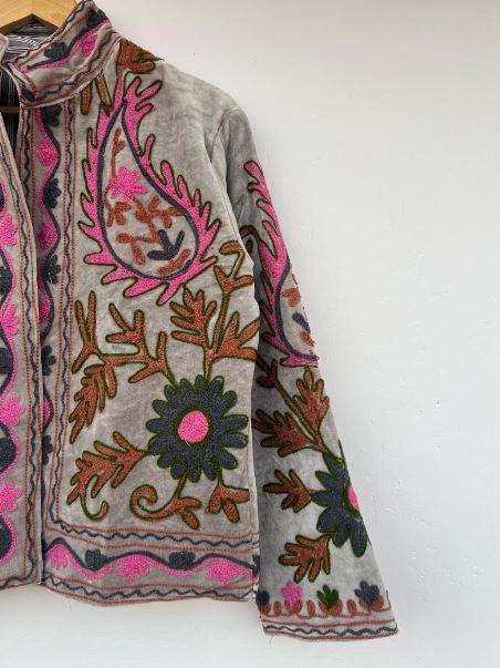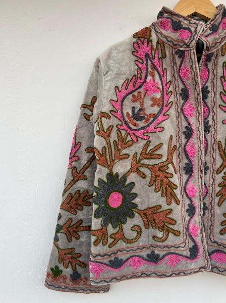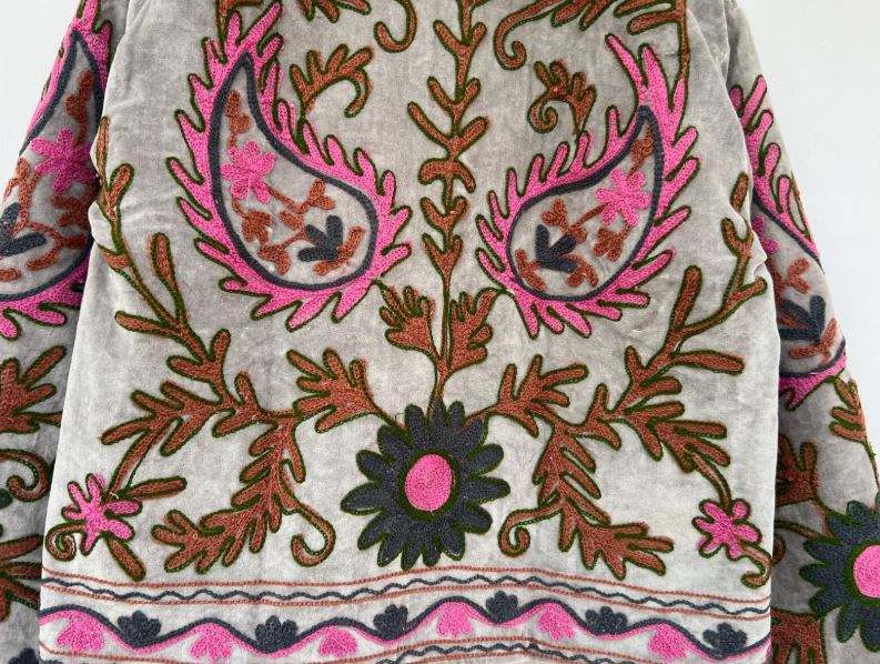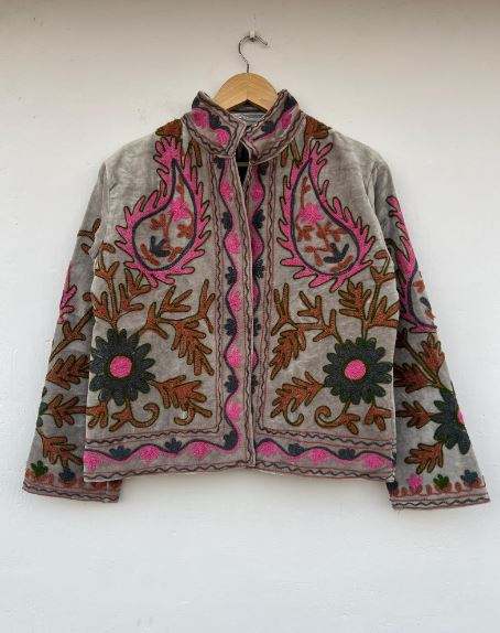 เสื้อโค้ทซูซานี แจ็คเก็ตดัสเตอร์สไตล์วินเทจ เสื้อแจ็คเก็ตซูซานีฤดูหนาว ทำมือ ลายดอกไม้ปักลายซูซานี เสื้อแจ็คเก็ตกำมะหยี่ปักลายโบฮีเมียนสำหรับฤดูหนาว