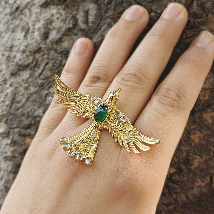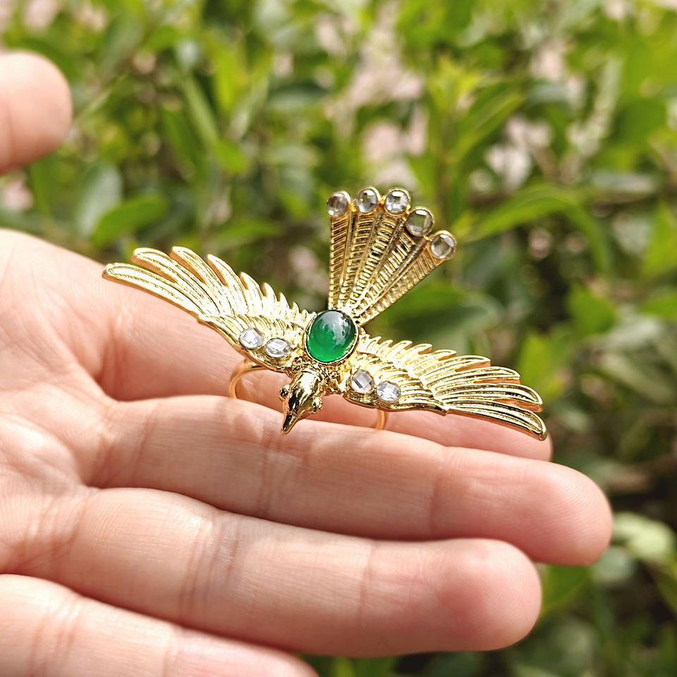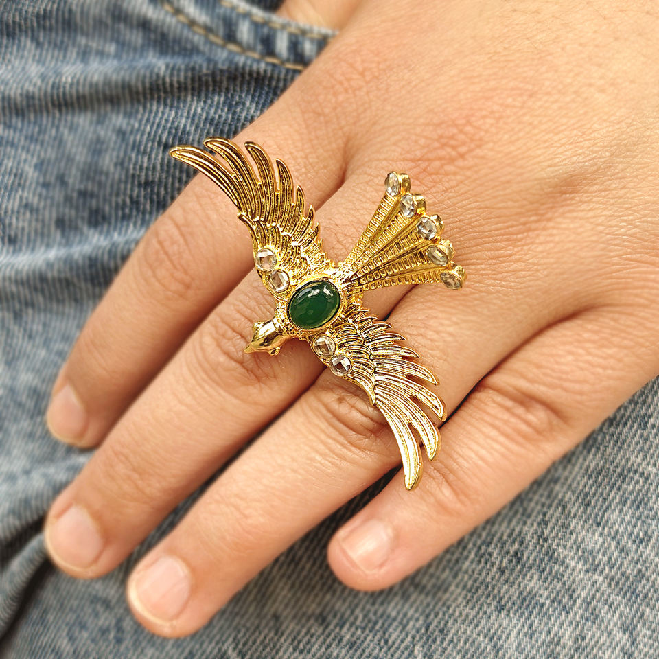 แหวนค็อกเทลประดับพลอยออนิกซ์สีเขียวทรงสวยงาม พร้อมเพชร CZ ประดับตกแต่ง แหวนทองเหลืองชุบทอง 18k ปรับขนาดได้ รูปนกอินทรีบิน