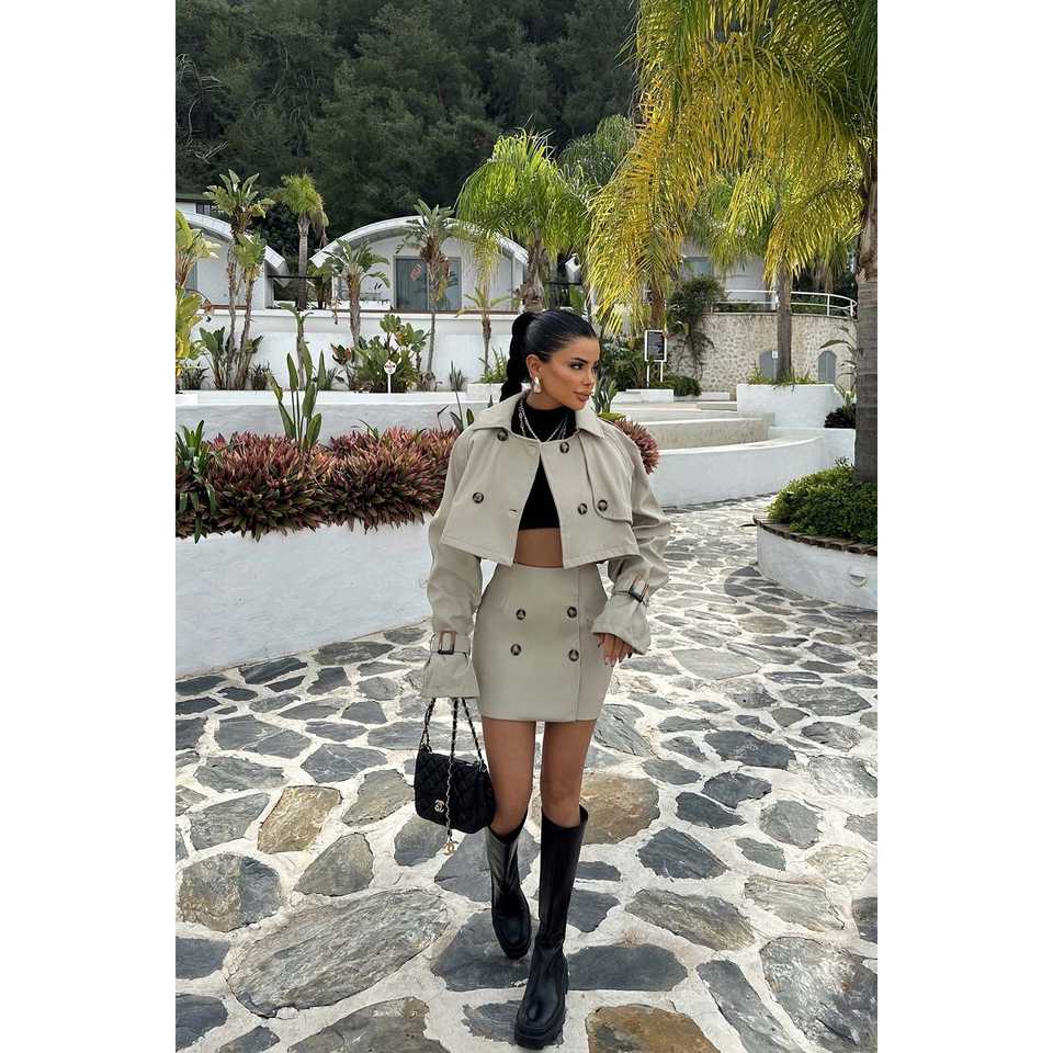 ชุดกระโปรงผ้าขนสัตว์เอวสูงสีเบจโคโค่ พร้อมเสื้อติดกระดุม ดีไซน์ใหม่ล่าสุด ชุดลำลองสำหรับผู้หญิง ทรงหลวม ตกแต่งด้วยโลโก้