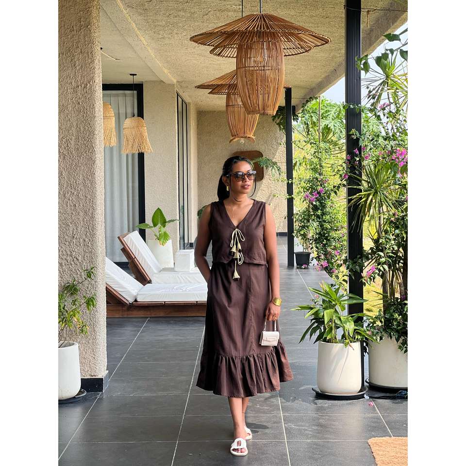 flared midi skirt,sleeveless crop top,V neck,tie up style,frilly touchStyle