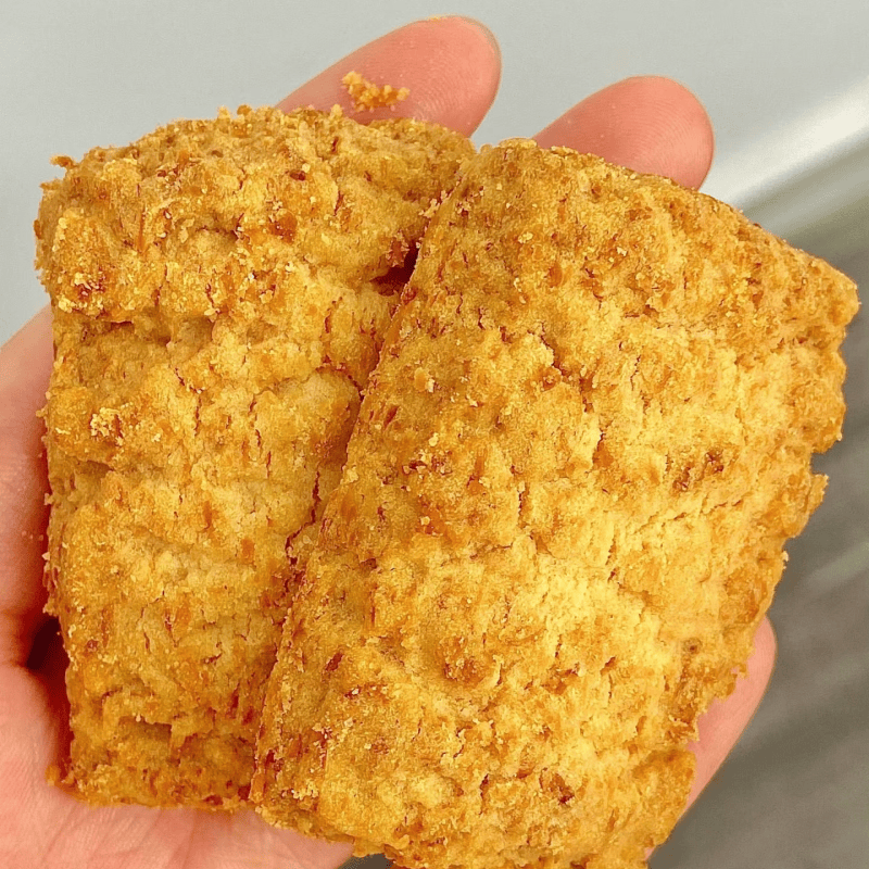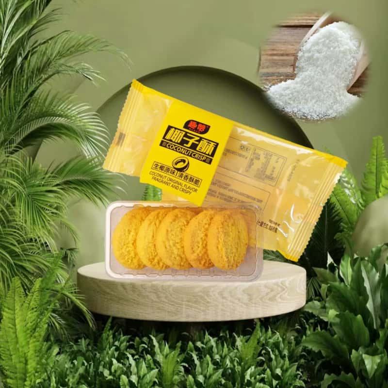 บิสกิตมะพร้าว กลิ่นมะพร้าวสดชื่น รสชาติกรอบอร่อย เหมาะสำหรับทานเล่นยามว่างและช่วงน้ำชายามบ่าย