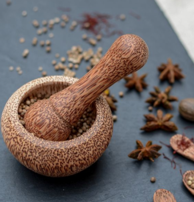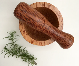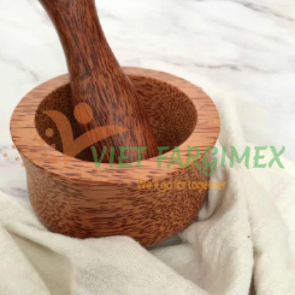 ครกและสากไม้มะพร้าว เป็นมิตรกับสิ่งแวดล้อม ทำจากไม้มะพร้าวที่ยั่งยืน ดีไซน์เรียบง่าย ชุดสามชิ้น ใช้งานได้อย่างมั่นคง
