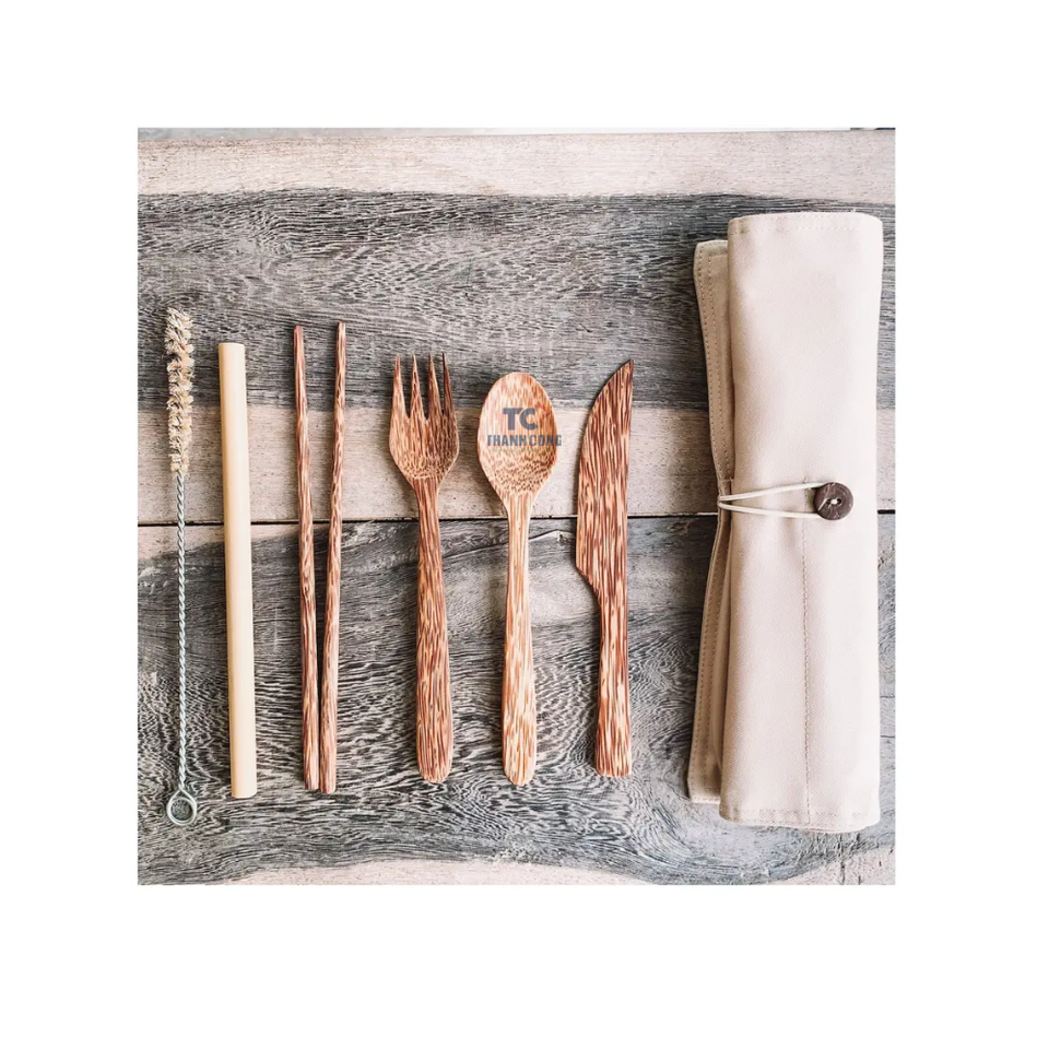 ชุดช้อนส้อมมะพร้าวแบบนำกลับมาใช้ใหม่ได้ชุดช้อนส้อมไม้มะพร้าวพร้อมหลอด