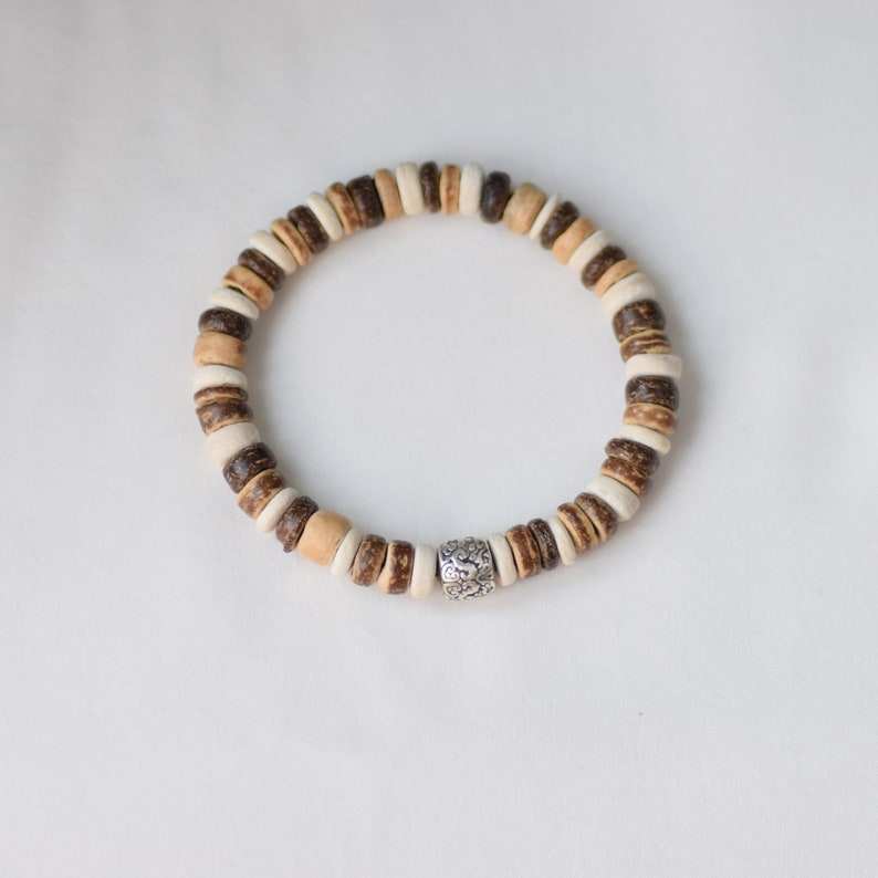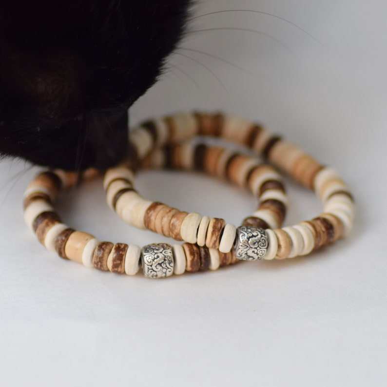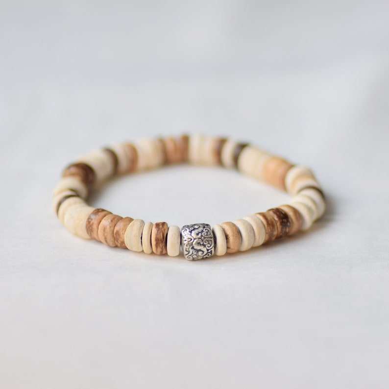 กำไลข้อมือไม้มะพร้าวประดับลูกปัดธรรมชาติ กำไลบำบัดสำหรับผู้หญิงผู้ชาย กำไลไม้ยืดหยุ่นแบบซ้อนได้ เครื่องประดับสไตล์โบฮีเมียนสำหรับนักโต้คลื่น